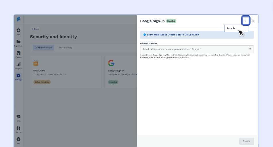 Login to your SpotDraft Account and navigate to ‘Settings’ → ‘Security and Identity’.