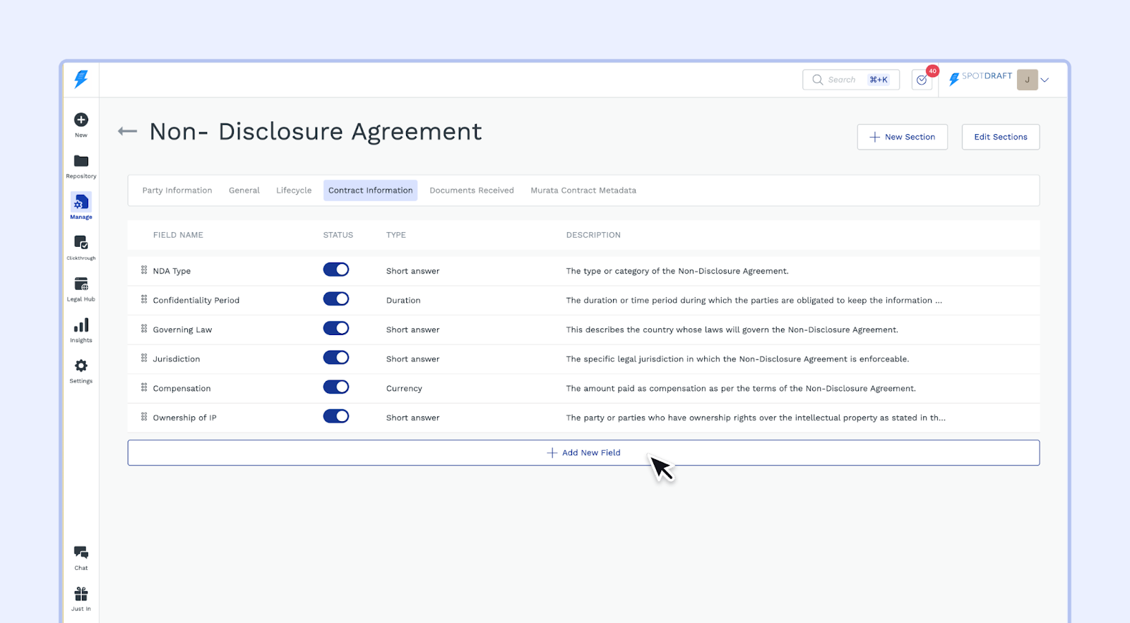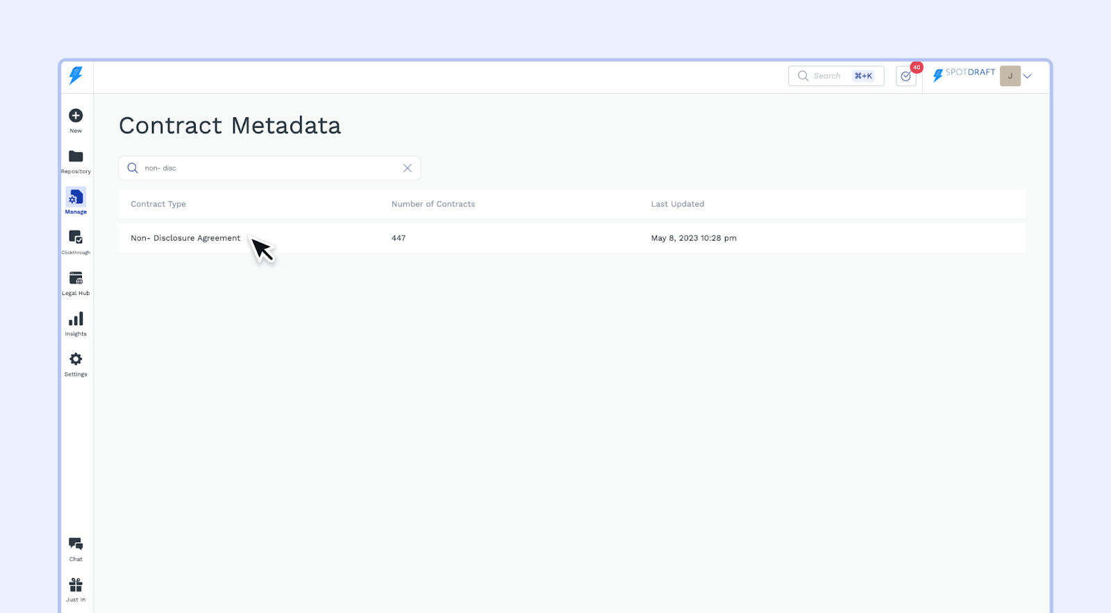 From your SpotDraft dashboard, navigate to the "Manage" section on the left sidebar and select the “Contract Metadata” option. Pro tip: Hit Cmd+K on a Mac (or Ctrl+K on a Windows PC) to open Quick Access and type “Contract Metadata”.