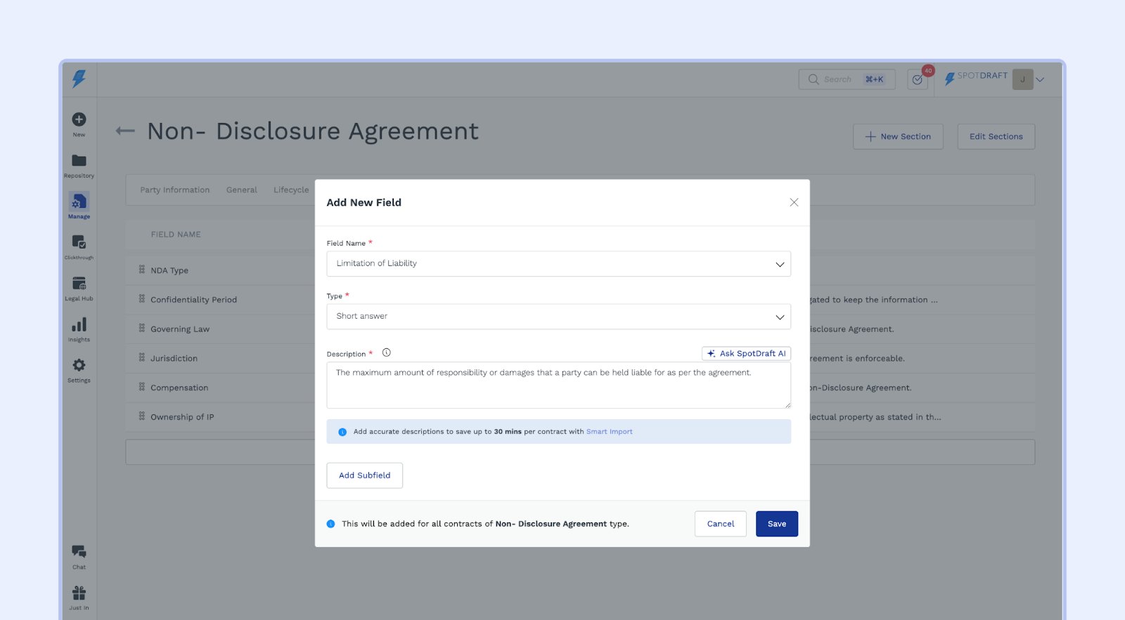 - Description: A brief explanation of the field and its purpose. This description is used by SpotDraft AI to accurately fetch this information from contracts automatically. Treat this description as in instruction for the AI to fetch the right information, for example “Jurisdiction: this is the location whose courts will preside over any disputes arising from this agreement”