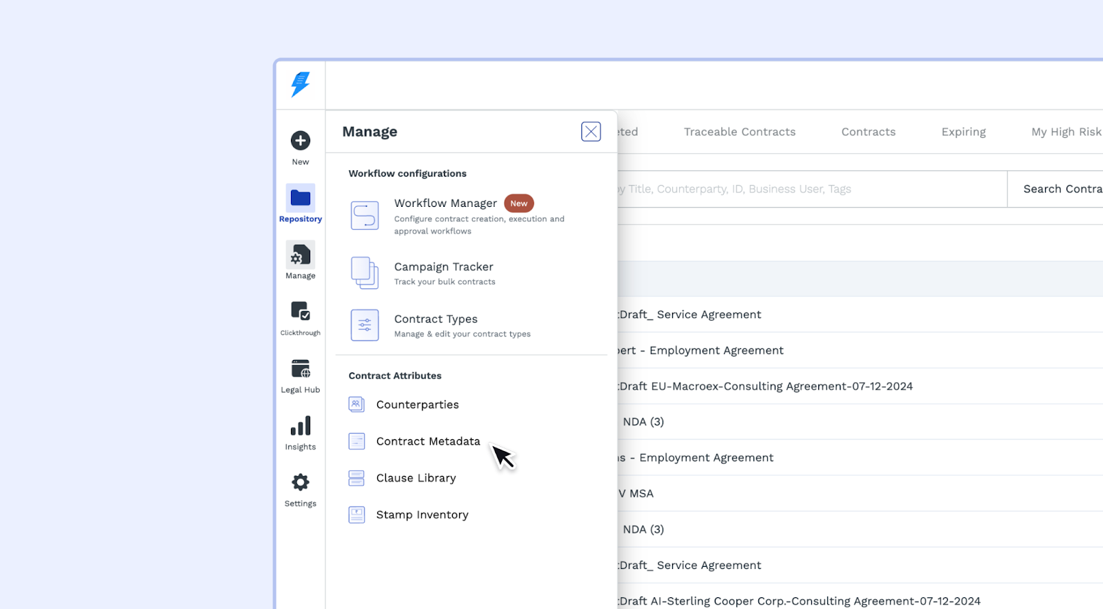 - Repository Filters & Columns: Filter contracts within the repository based on metadata values. You can also choose to add specific metadata fields as columns in the repository view for easier access to the data.