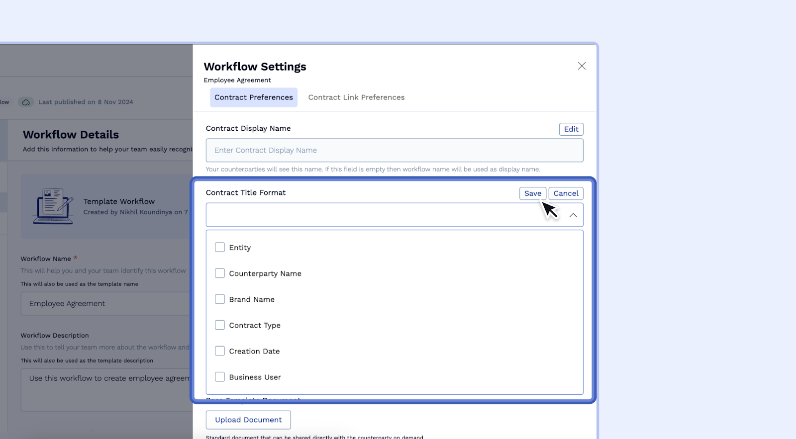 - Save and Publish: Once you have selected your preferred variables, click "Save." Then, click "Publish New Changes" to apply the new naming convention to all future contracts created using this workflow.