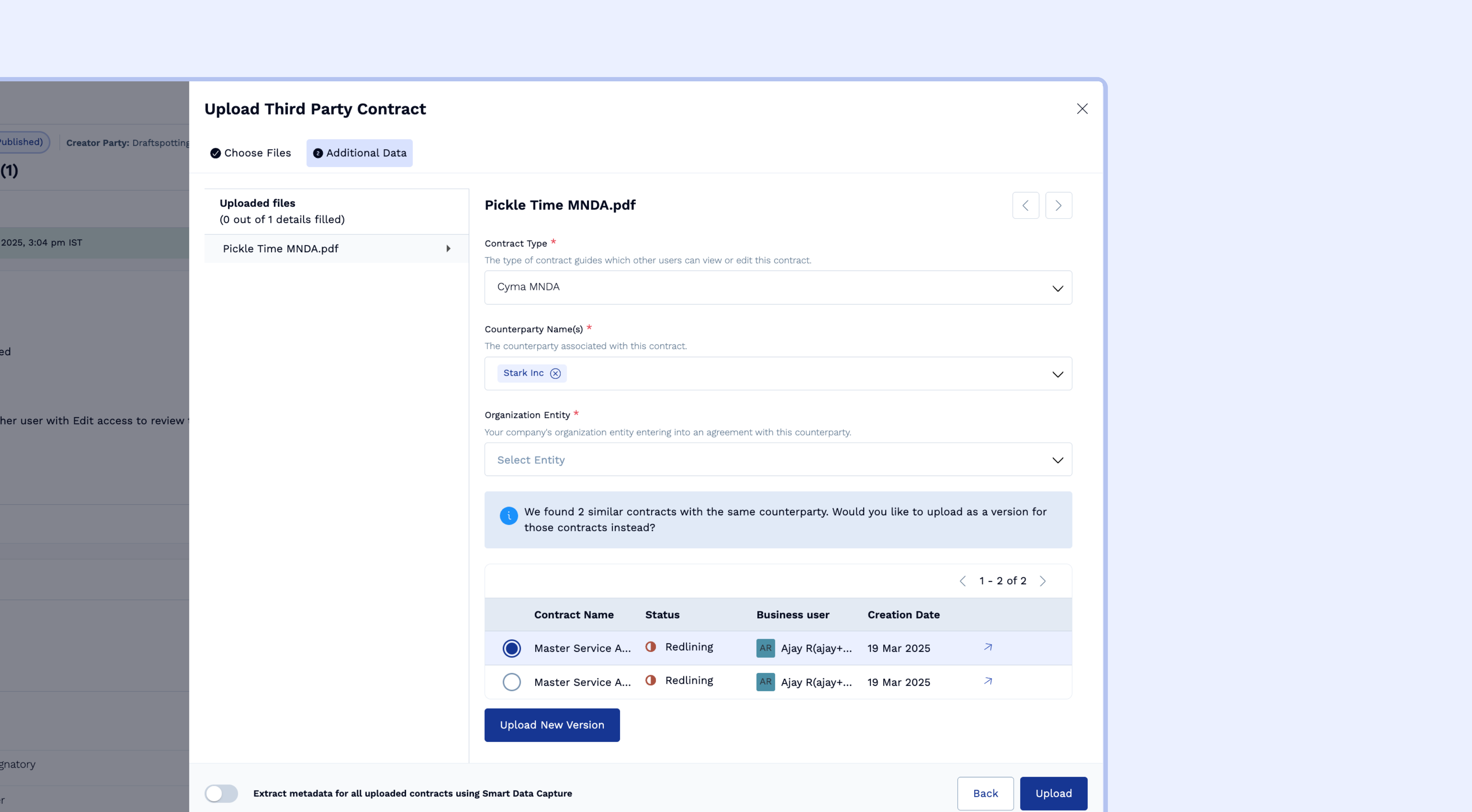 Enter Metadata: Select the contract type, counterparty name(s), and your organization entity.