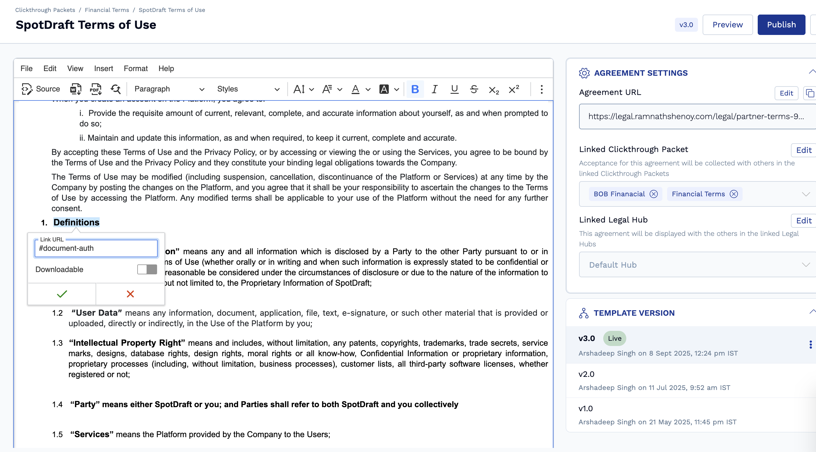 Using the Clickthrough Editor, you can create hyperlinks between sections within the same agreement. Follow these simple steps: