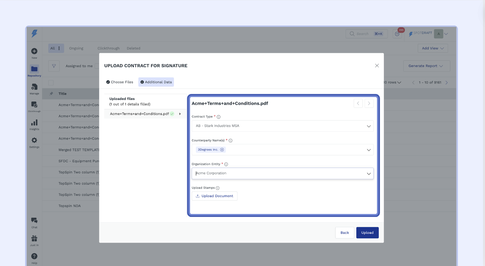 Upload the Contract: Click the "Select Files" button and select the contract document from your computer. SpotDraft supports .doc, .docx, and .pdf file formats.