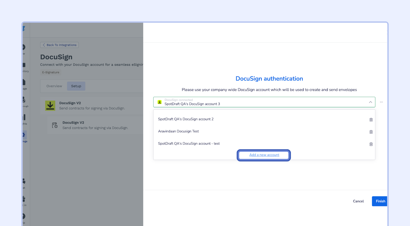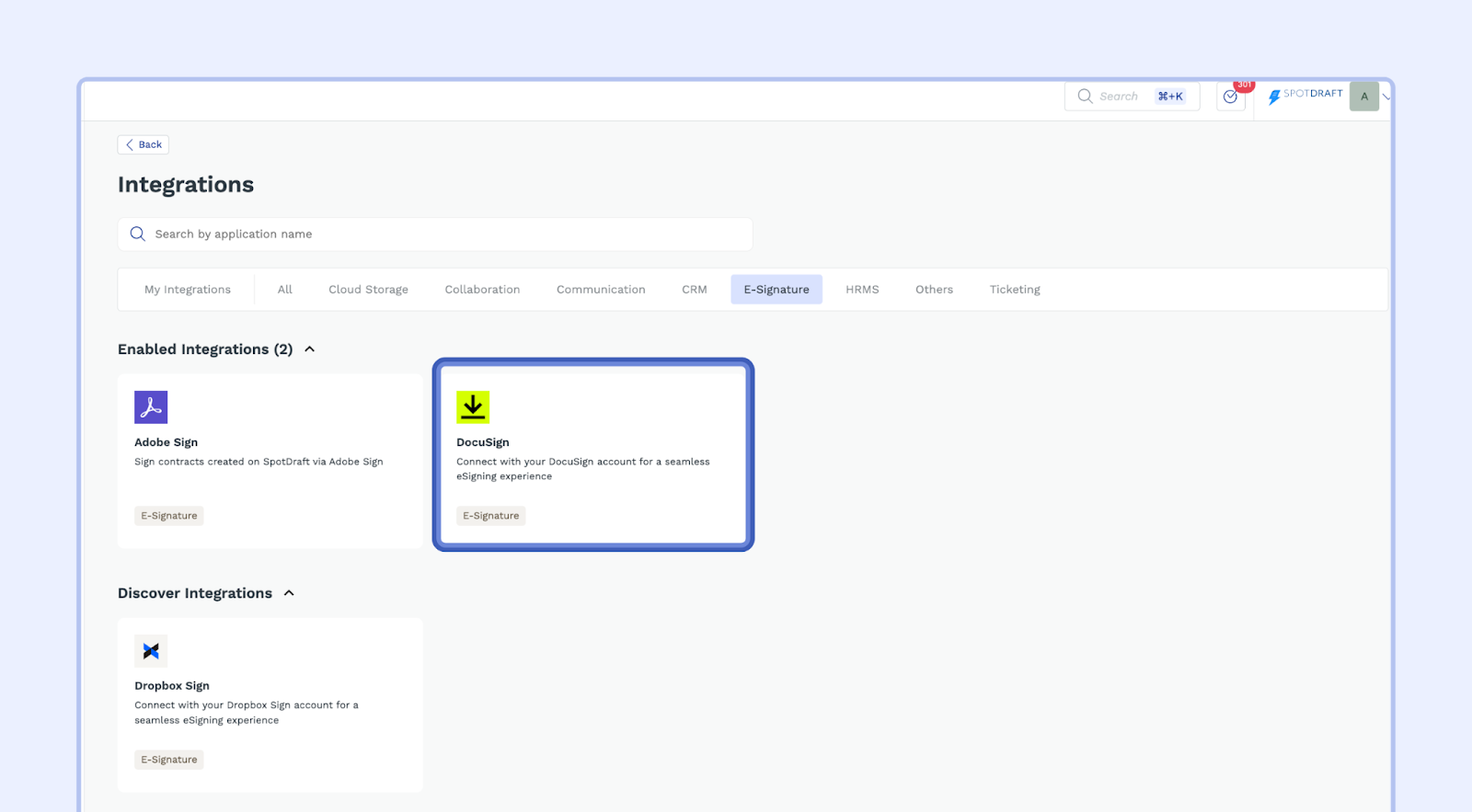 This section will guide you through the process of configuring the DocuSign integration within your SpotDraft workspace. This integration allows you to seamlessly send contracts for eSignatures using DocuSign.