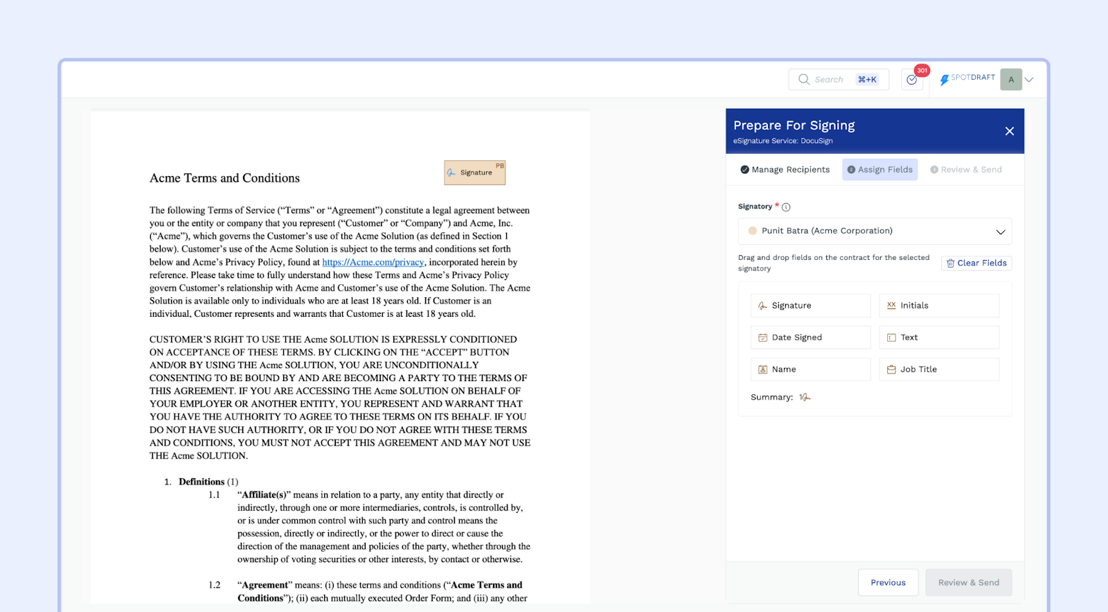 This section will walk you through the steps of sending a contract for signature using the DocuSign integration within SpotDraft.