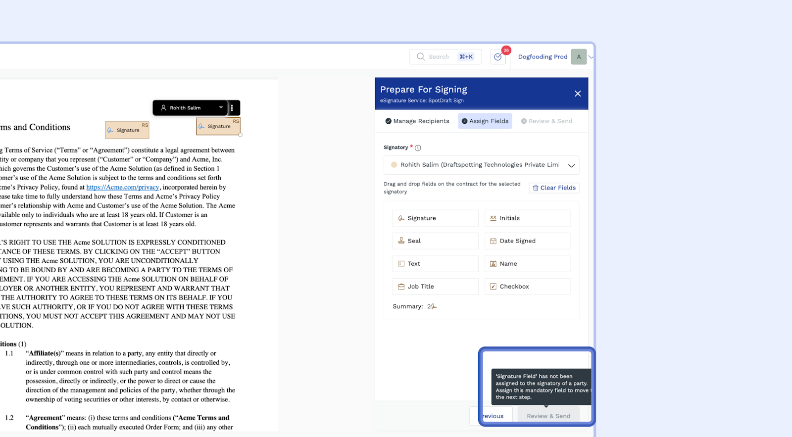 Note:- To proceed with preparing the contract for signatures, make sure to assign fields to all the signatories of the counterparty. If this isn't done, you will be blocked from moving to the next step.