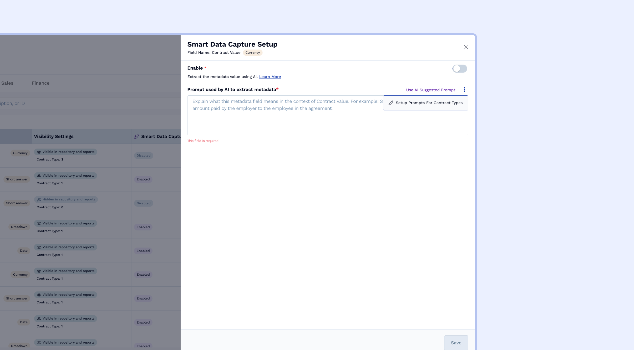 - SDC can automatically extract values from uploaded documents into metadata fields. You set this up in Metadata Manager > Edit Smart Data Capture Setup, where you can provide prompts for AI extraction. You can create a global prompt (used across all contract types) and also set up contract-type-specific prompts for accuracy.