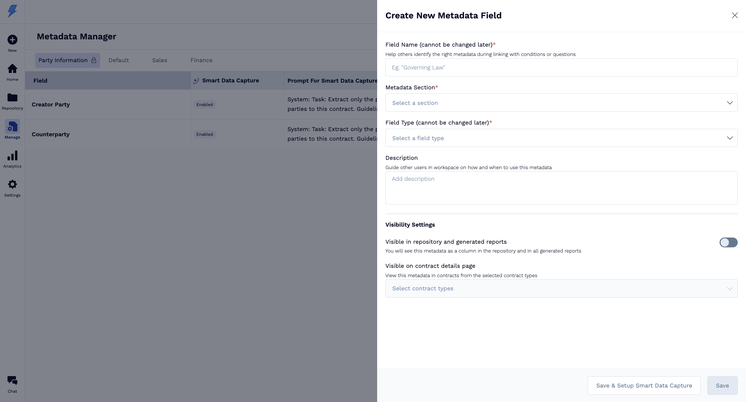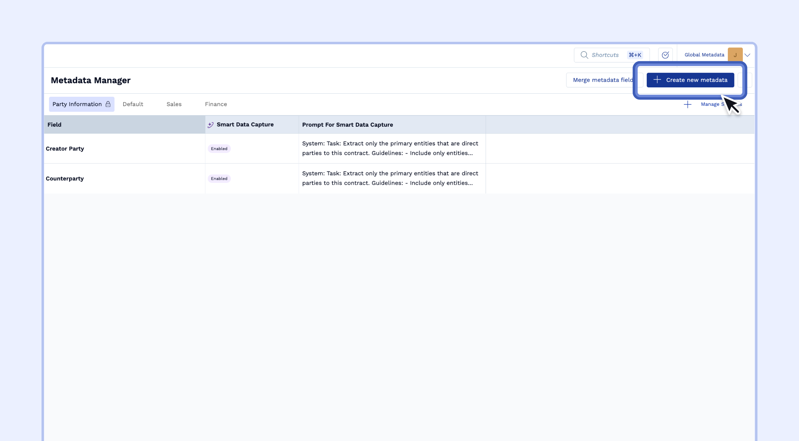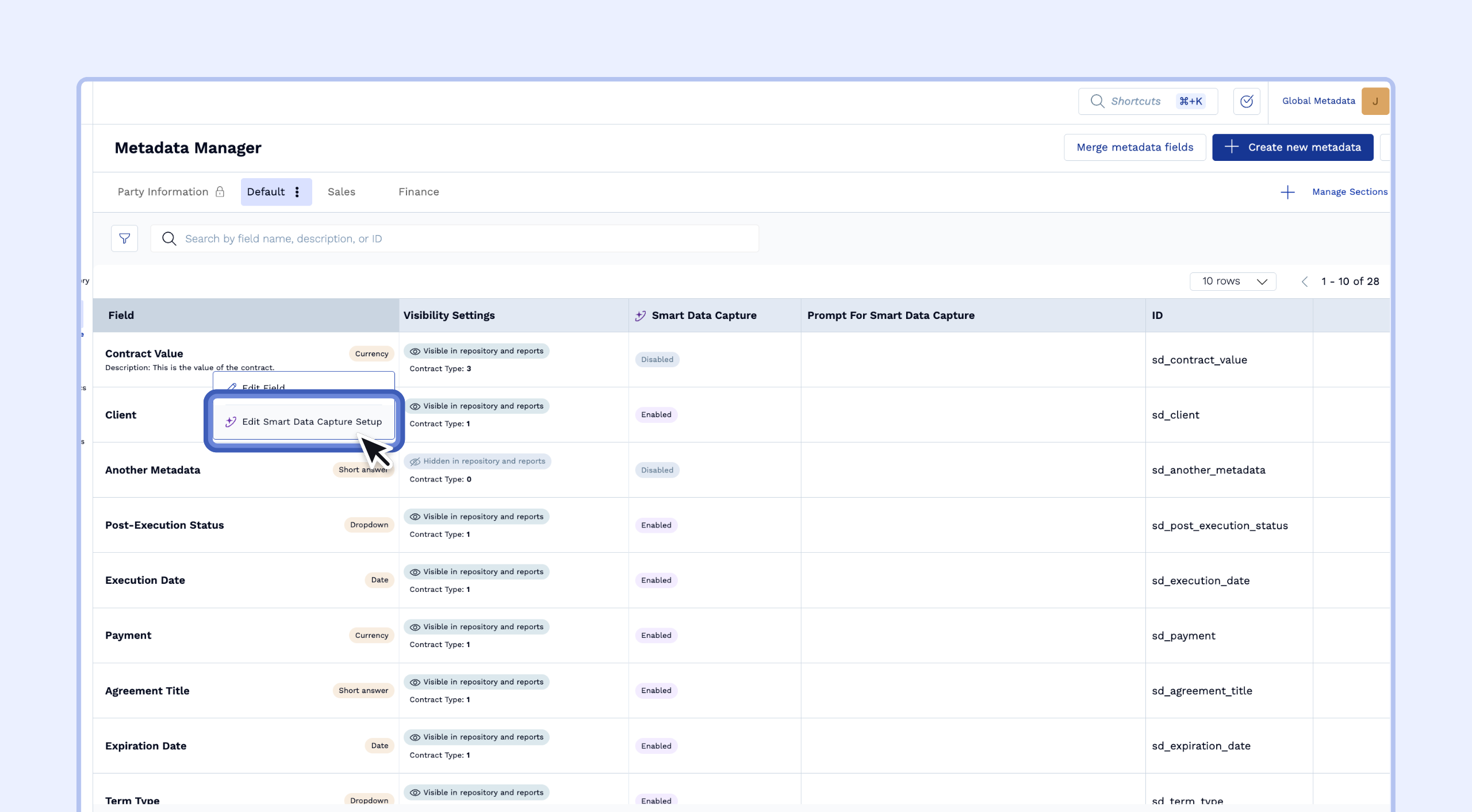 - Global Sections: These are folders used to organize your metadata fields (e.g., Party Information, Sales, Default). They are no longer tied to specific contract types.