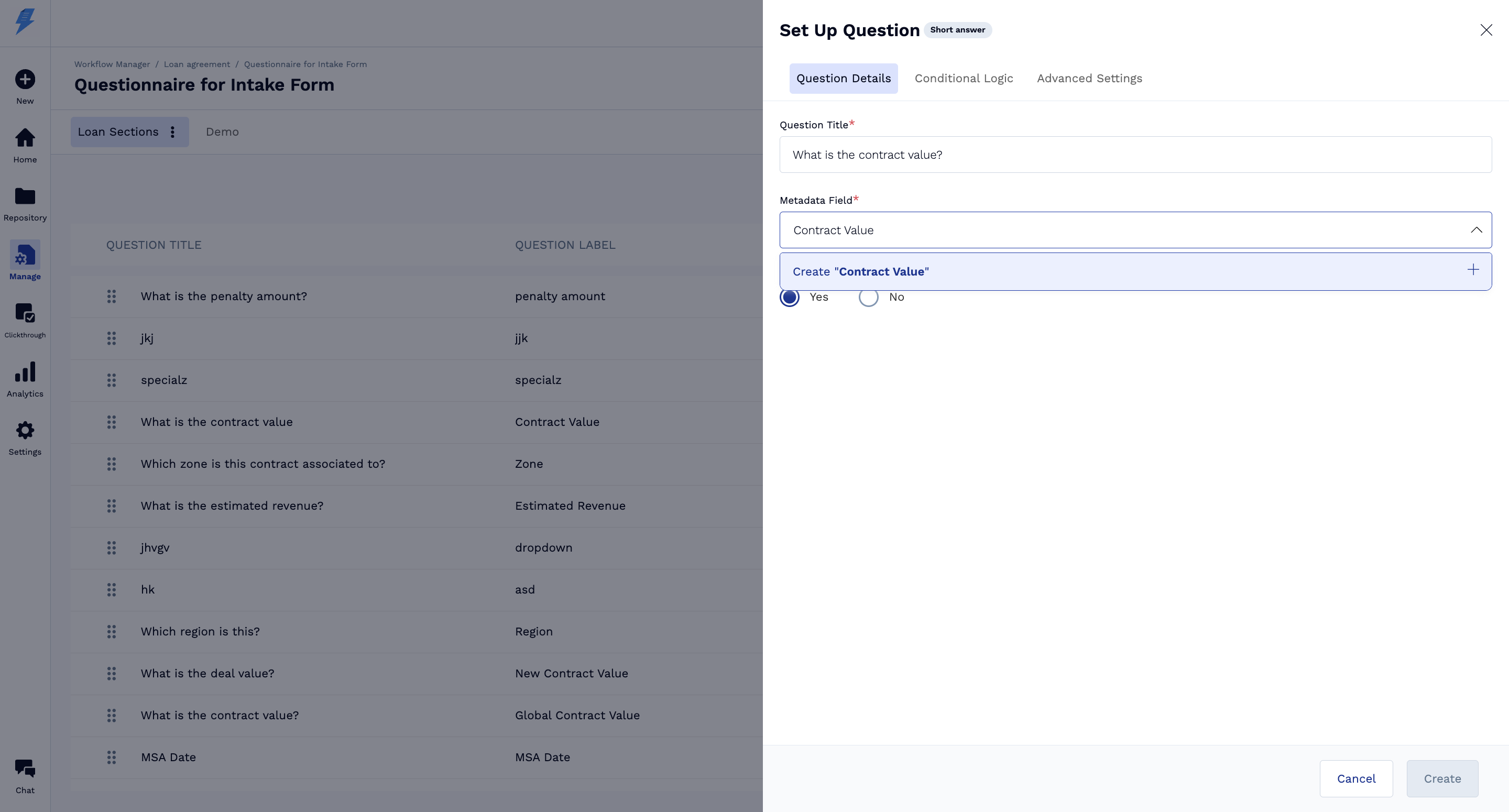 - Yes. While setting up an intake form in the Workflow Manager, you can create a new metadata field on the fly. This opens the same creation modal used in the Metadata Manager.