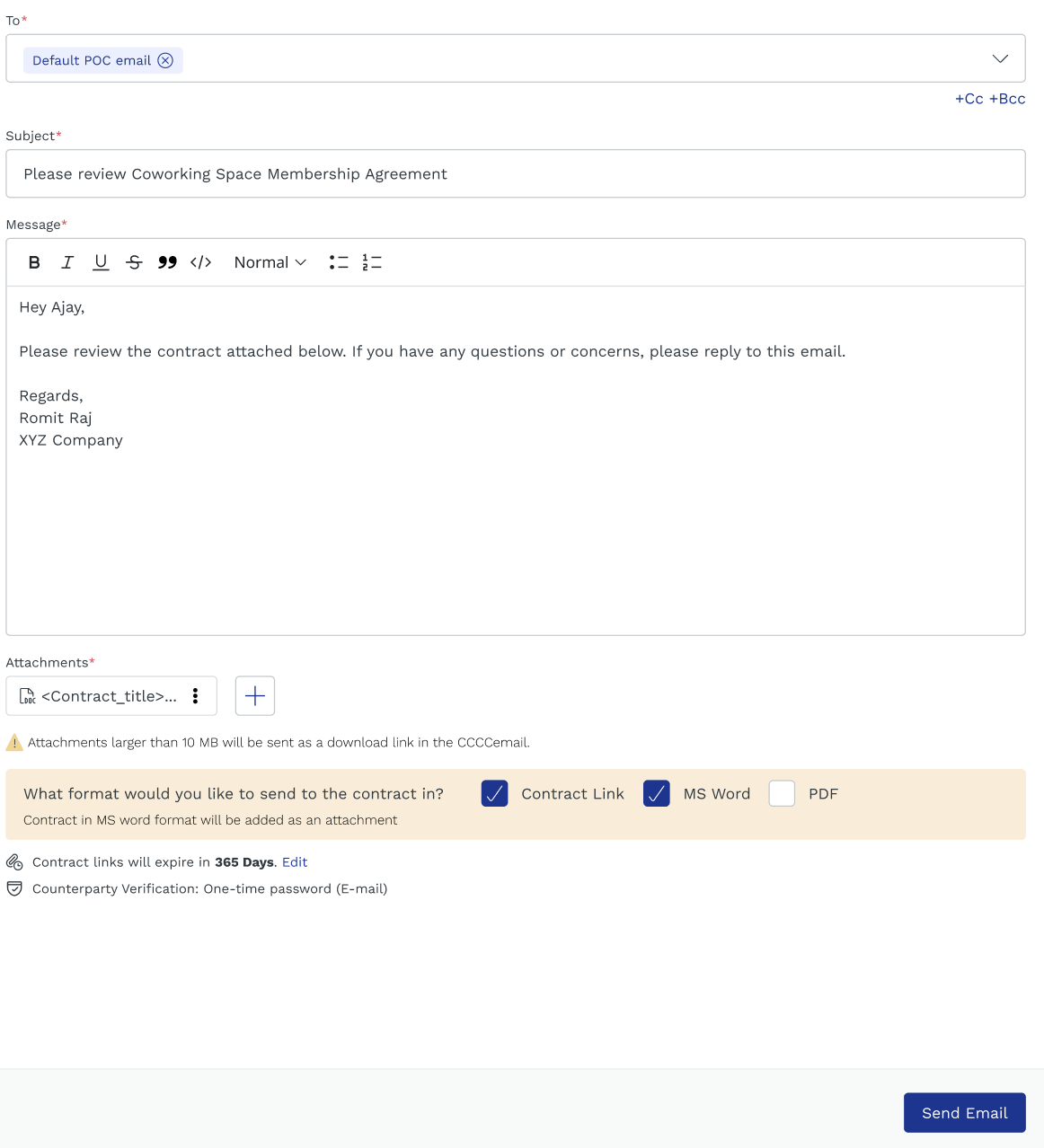 For Counterparty Review and Share Executed Contract emails, users can modify the email content just before sending the contract. The message configured in the Workflow Manager will be pre-filled but editable in the Send Contract interface.
