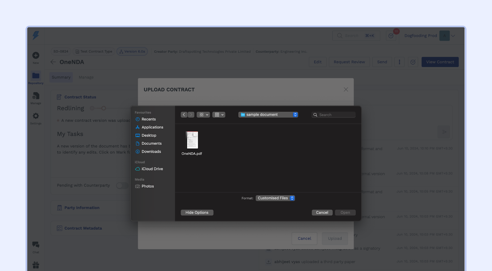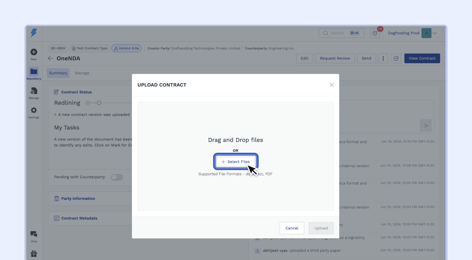 - In the "Upload Contract" window, you'll see options to either drag and drop your PDF file directly or click "Select Files" to browse your computer.