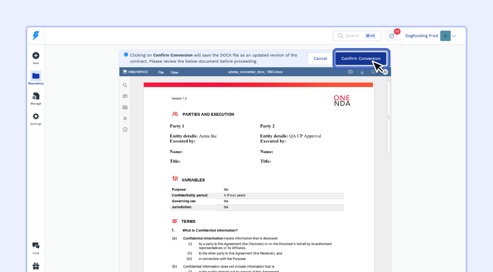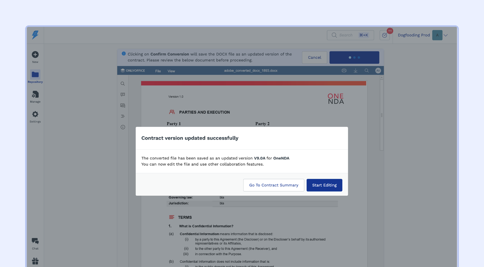 - If the preview looks good, click "Confirm Conversion" to save the converted contract as an updated version of the original.