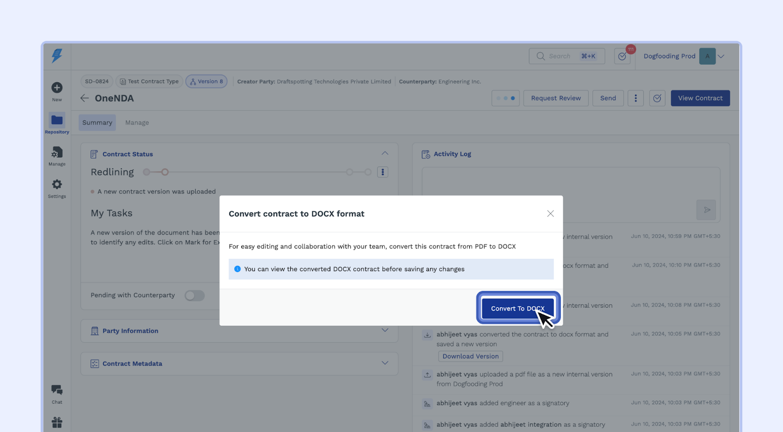 - SpotDraft will automatically recognize the PDF file and prompt you to convert it to DOCX format. A pop-up window will appear with instructions.