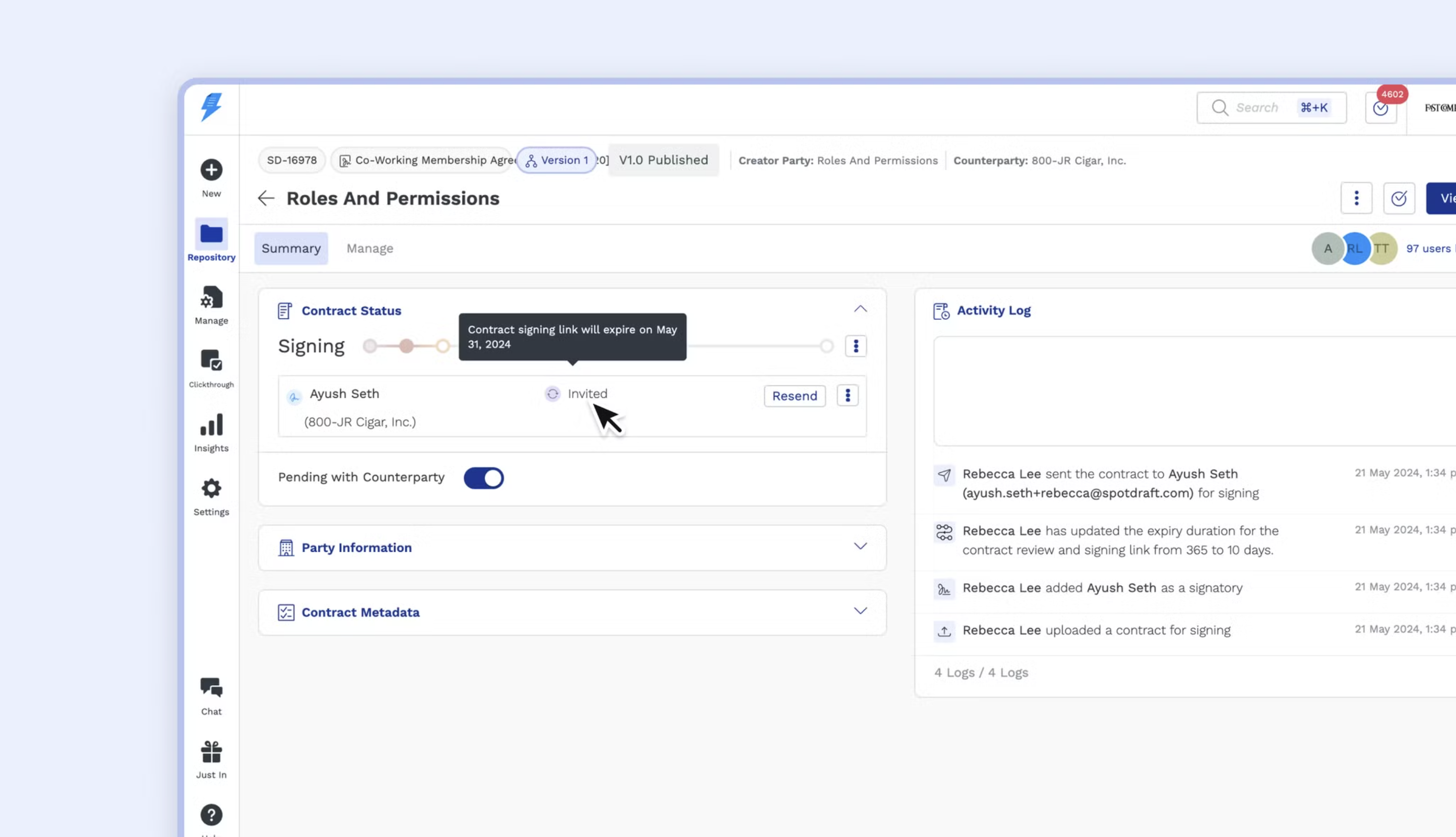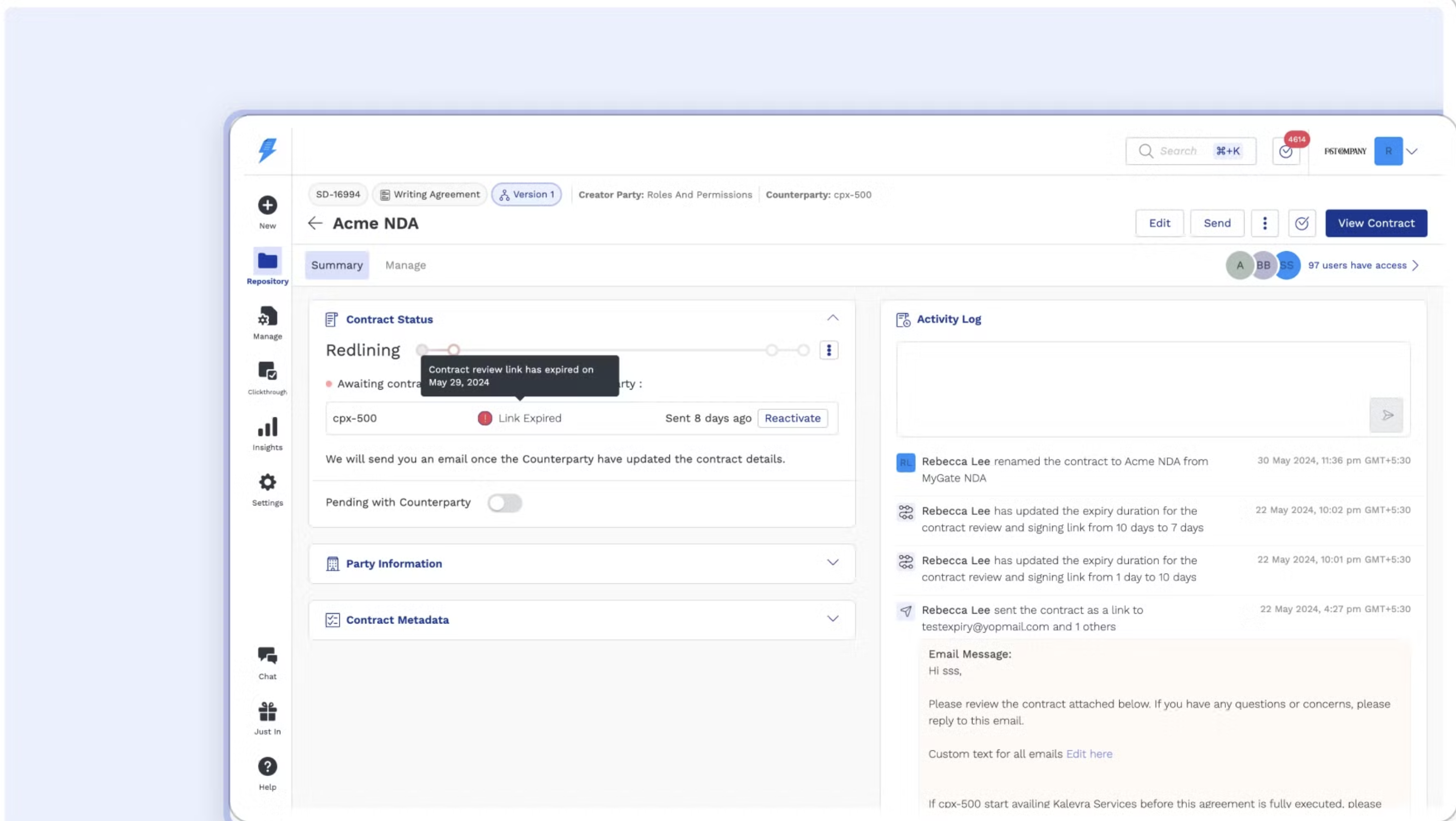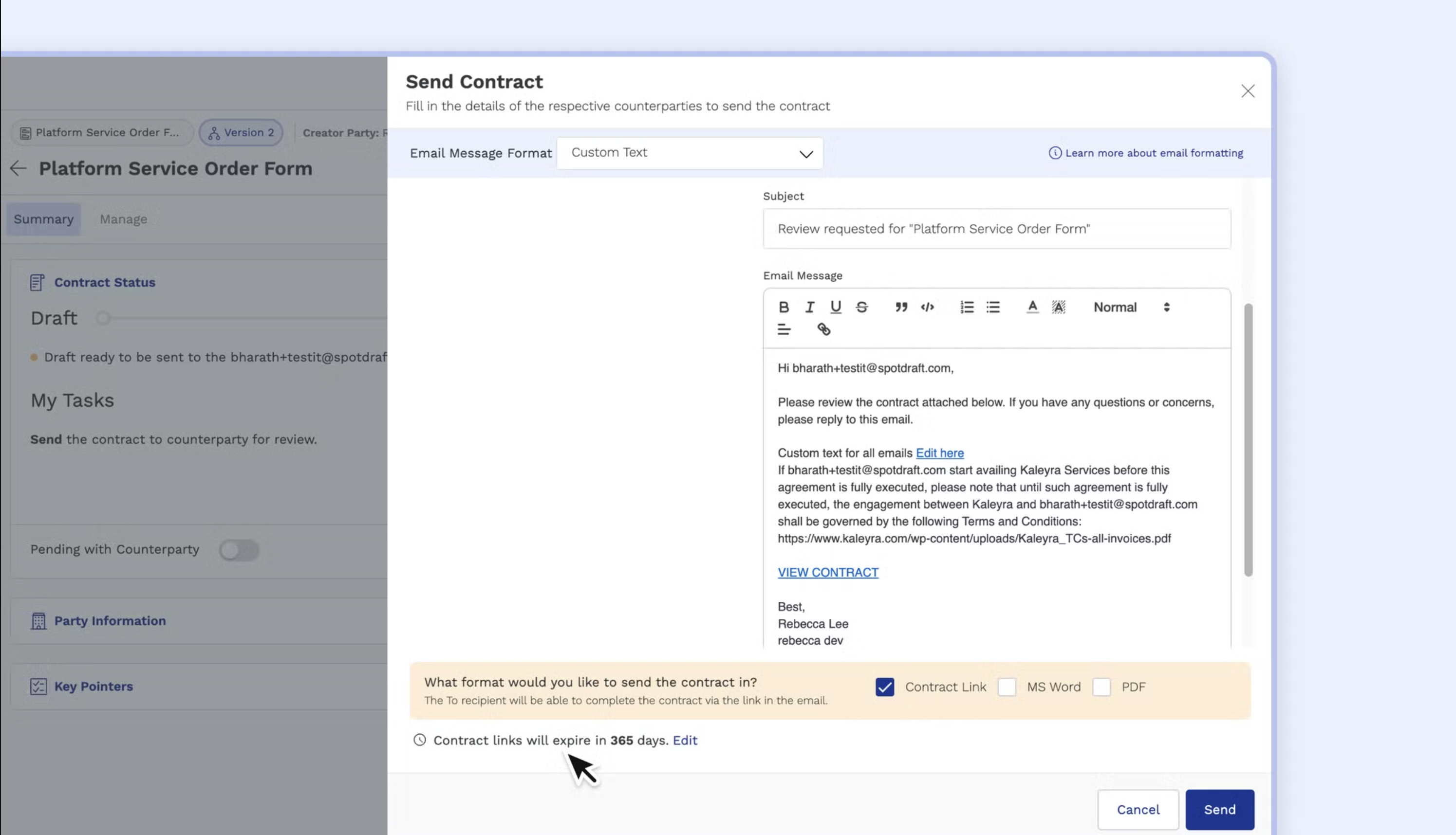 Note: The contract link expiry is only applicable to counterparty recipients. The creator party recipient can log in to access the contract.