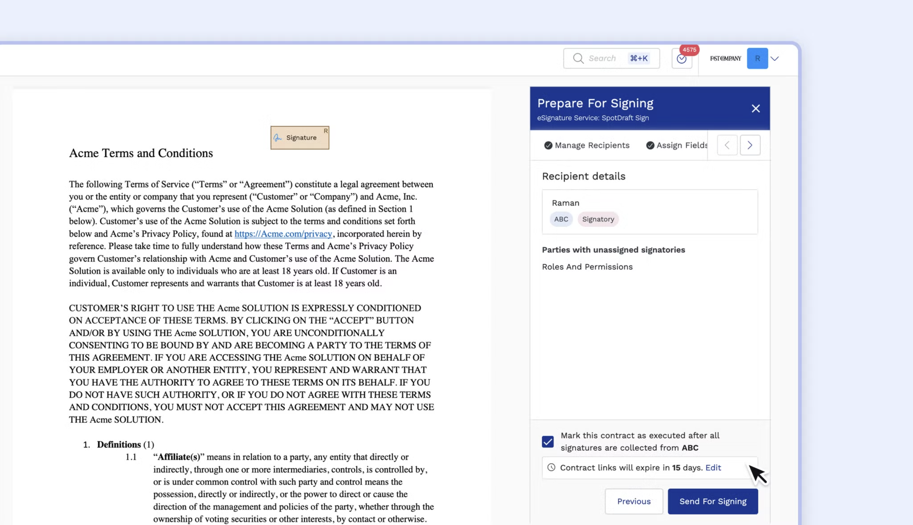 - Click on Send for Signing to send the contract for signature for entered expiration duration.