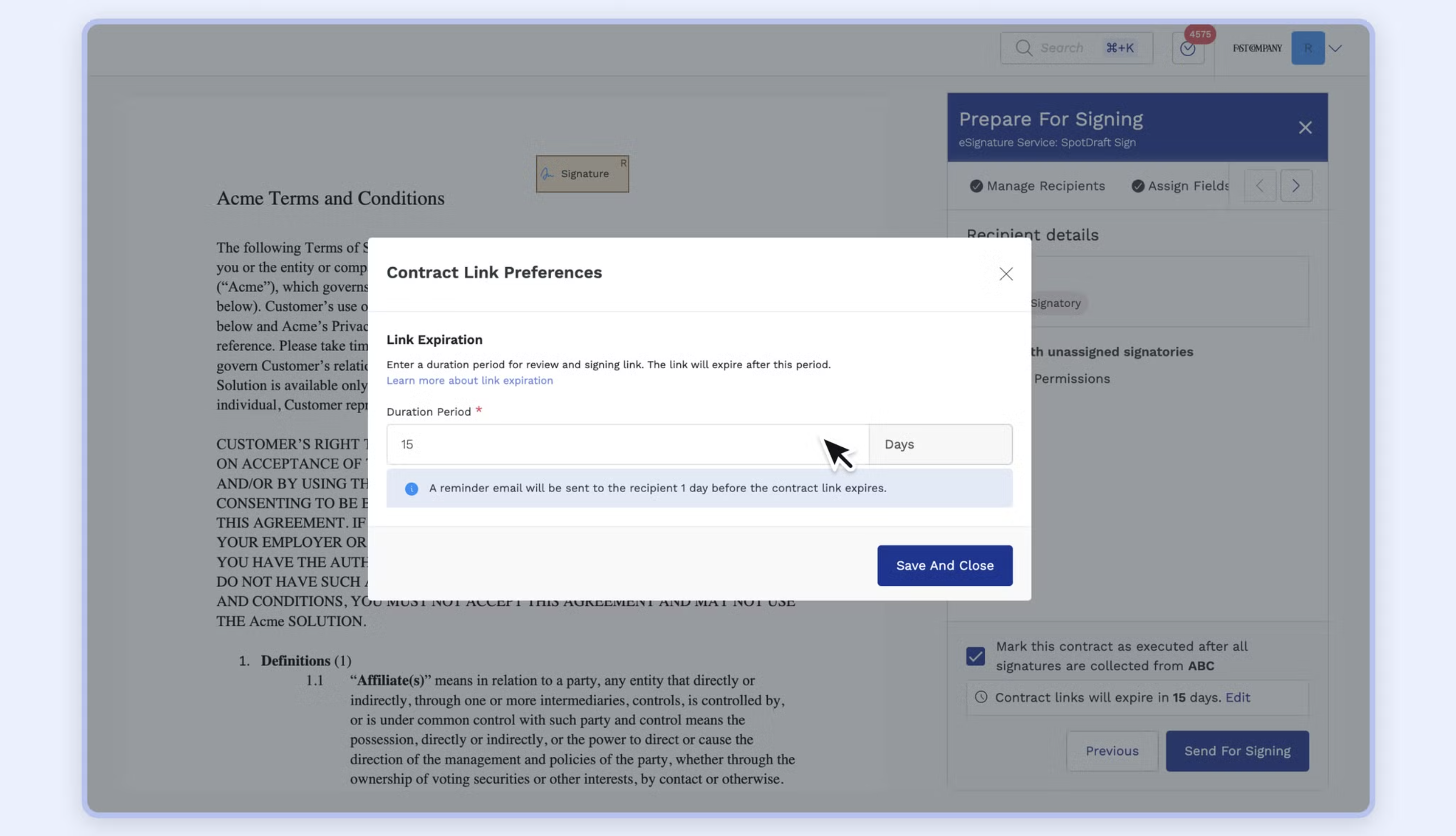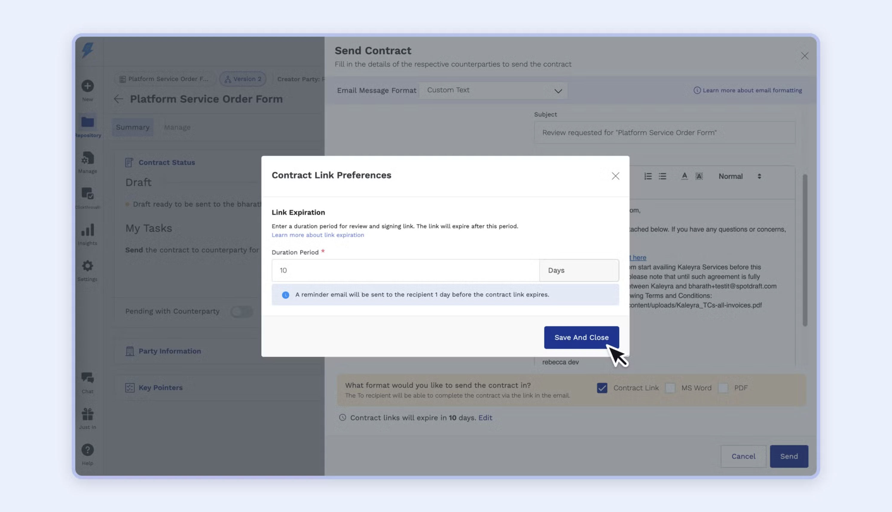 - In the contract link preferences modal, enter the duration after which the contract link will expire. Click on Save and Close.