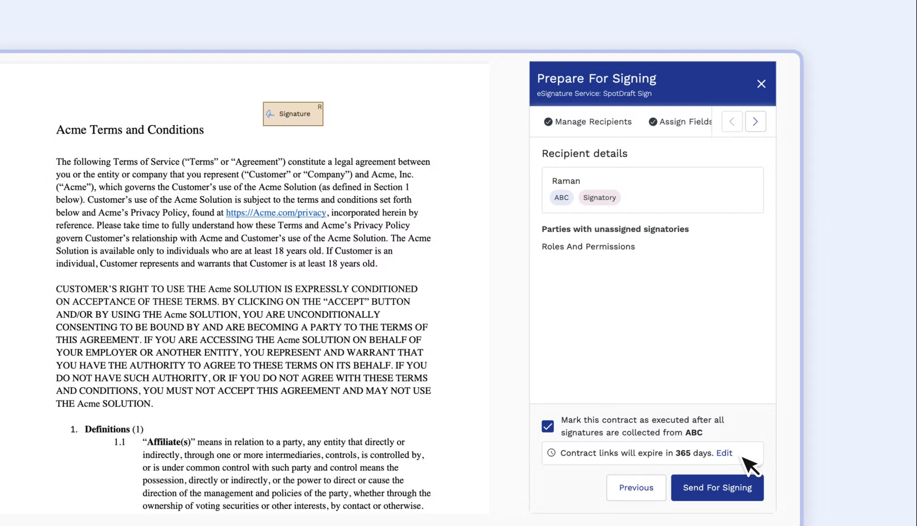The contract link expiry feature allows the SpotDraft users to set the duration after which the contract link(signing or review) becomes inaccessible to the counterparty. The users can adjust the expiry duration for active links, even after sending the contract for review or signing. If the link expires, users on SpotDraft who have the necessary permissions can send a new link to the counterparty recipient. By default, SpotDraft expires the counterparty signing and review links in 365 days.