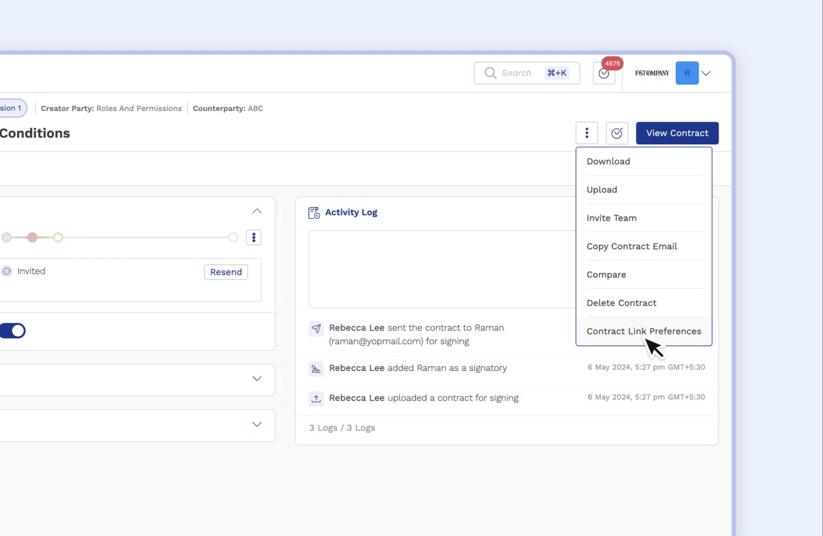 In-case you missed out setting up the expiration duration for contract links while sending to counterparty, you can set it up via “Contract Link Preferences” option in the overflow menu in the contract page. This will open up the Contract Link Preferences modal, from where you can edit the link expiration duration.