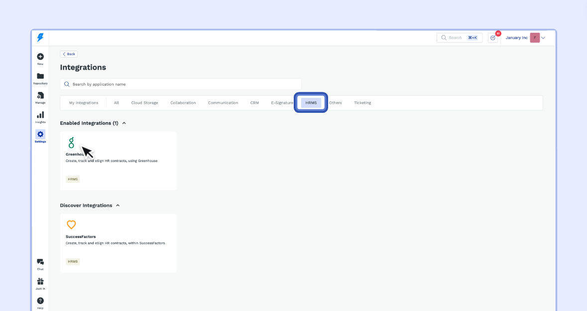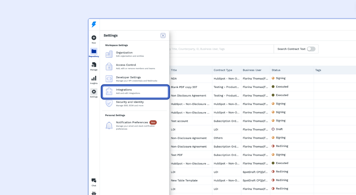 1 - Login to your SpotDraft workspace and navigate to Settings → Integrations.