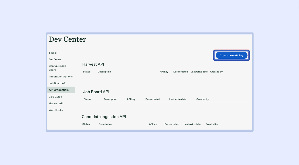1 - Login to your Greenhouse workspace and navigate to Configure → Dev Center → API Credentials.