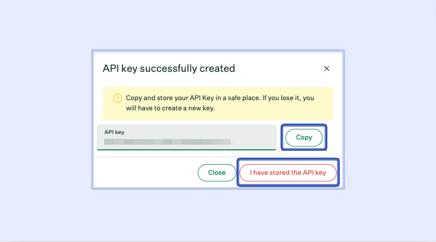 8 - Click I have stored the API key.