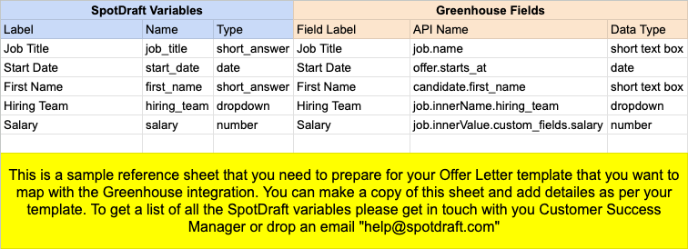 - Mapping Sheet: A mapping sheet is essential for automating the flow of data from Greenhouse to SpotDraft: