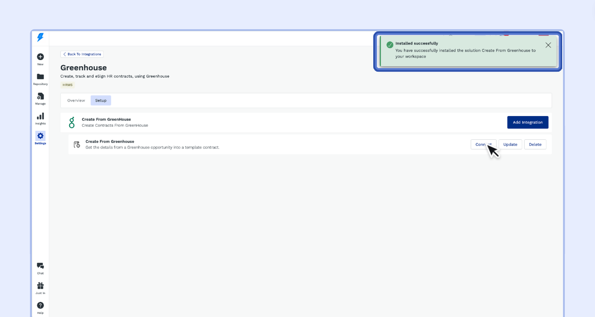 5.2 - After finalizing the wizard by clicking Finish, you will be directed back to the Integration page. A confirmation message stating 'Installed Successfully' will appear.