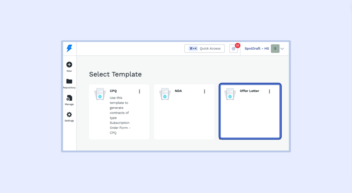 2.1 - Navigate to SpotDraft and hit ‘New’ from the side menu, select Template Contract and select the ‘Offer Letter’ template.