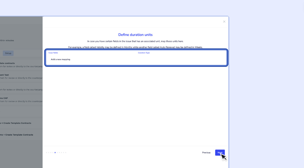 For any questions that have the SpotDraft Data Type set to ‘Duration’ in the mapping sheet, we need to define the duration’s unit e.g. Days, Weeks, etc.