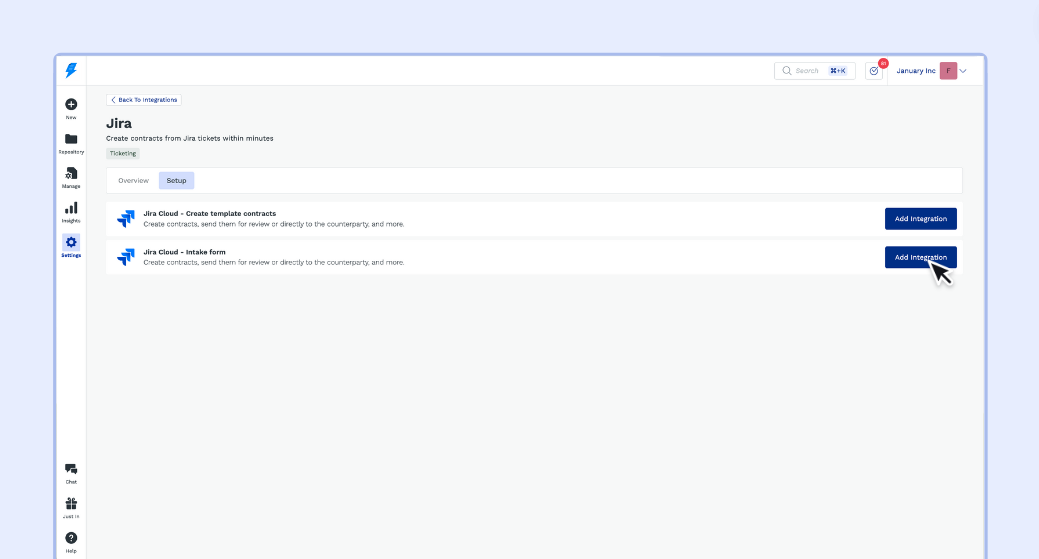 1 - Log into SpotDraft, navigate to Settings → Integrations → Ticketing, open the Jira card and select Setup from the top menu, then Click the Add Integration button on the Jira Cloud - Intake form option to open the setup wizard.