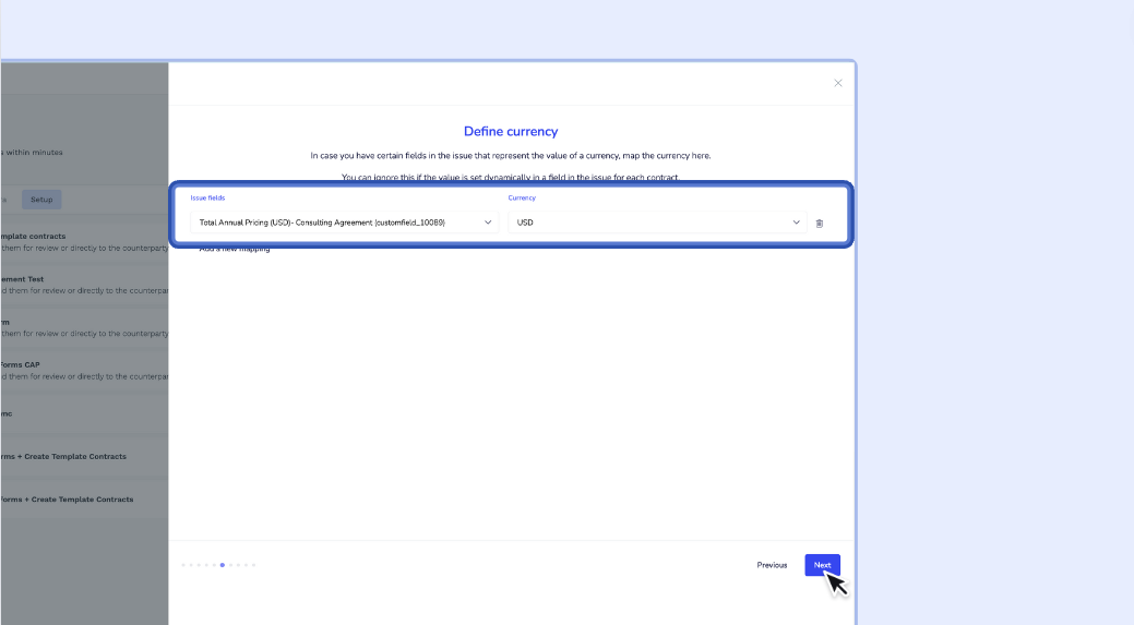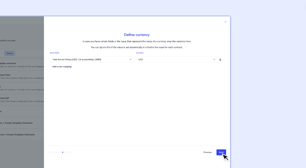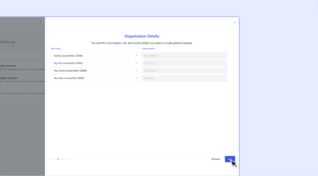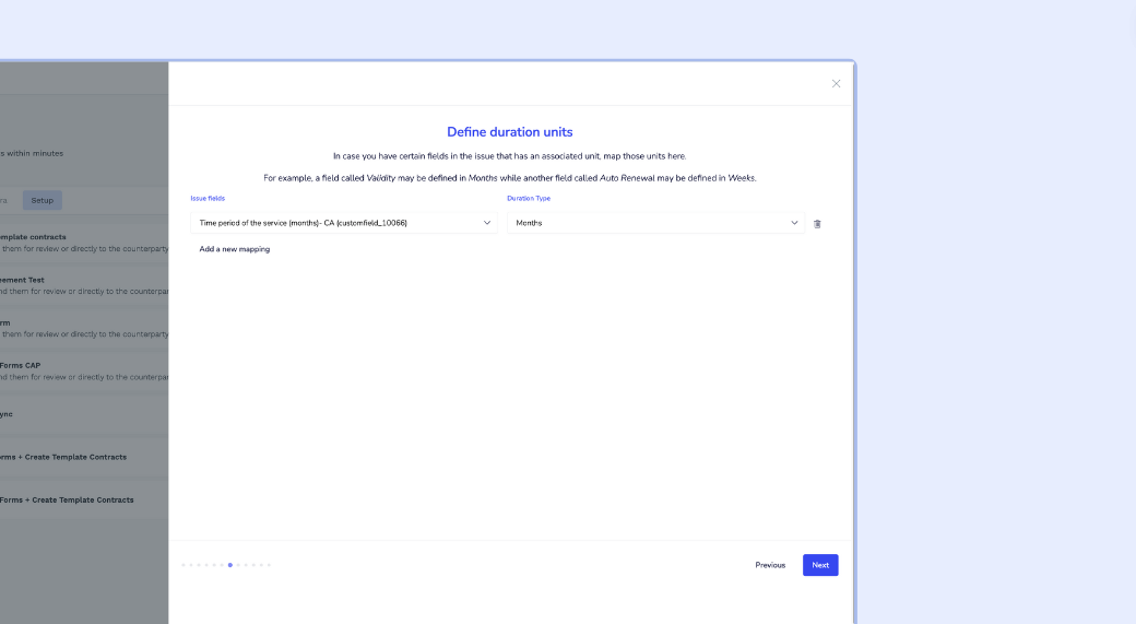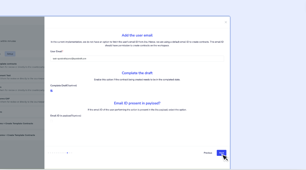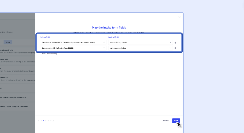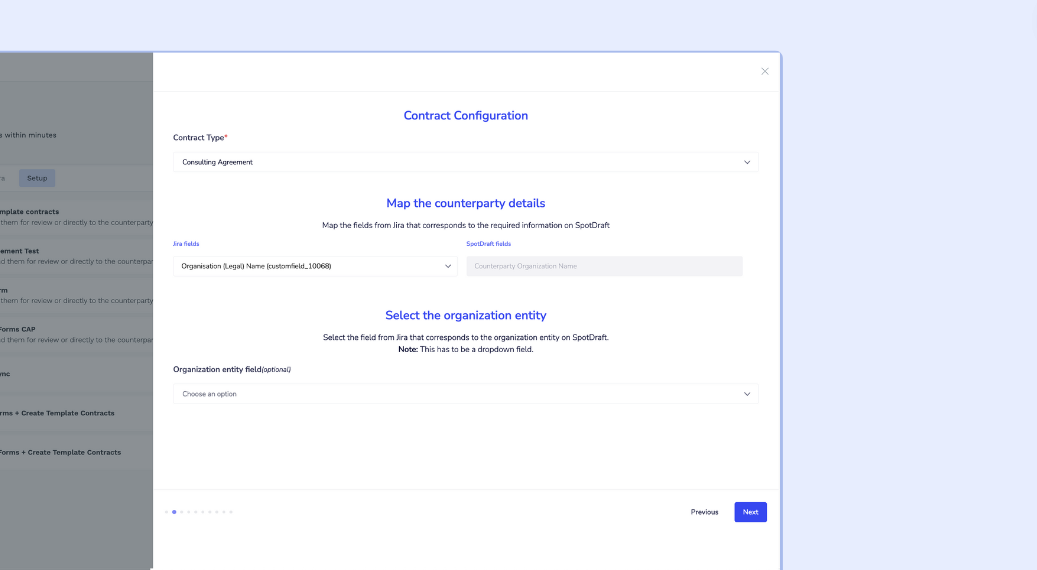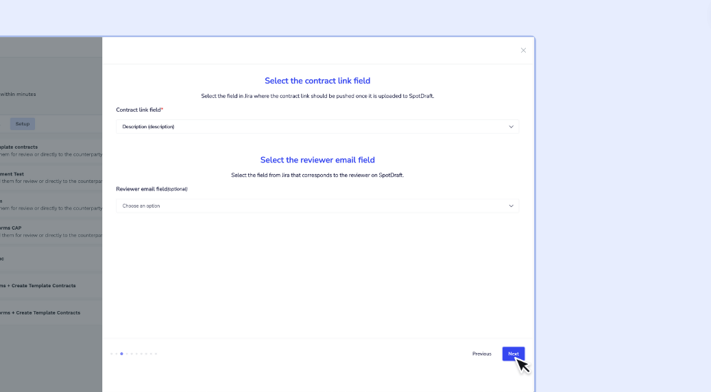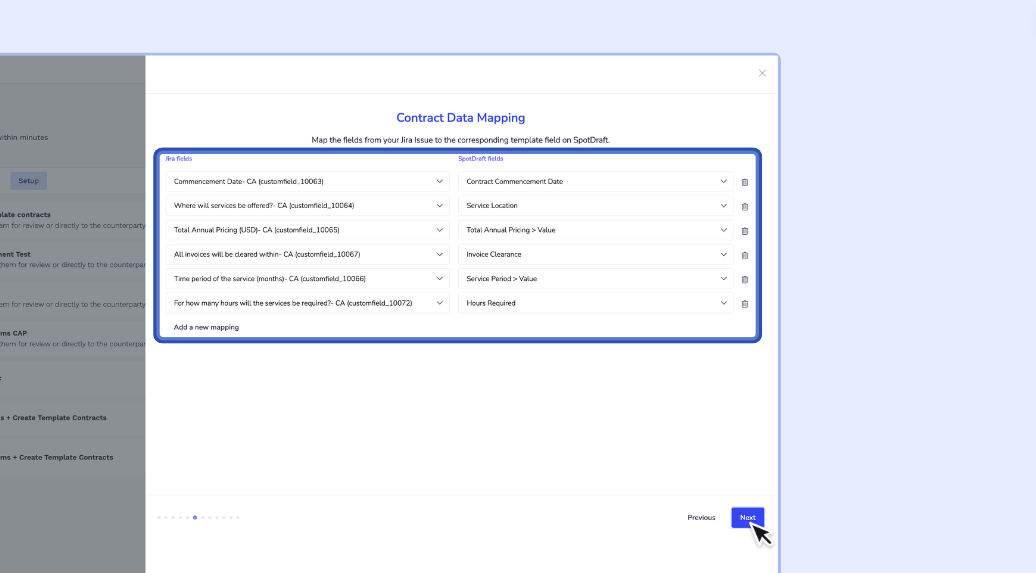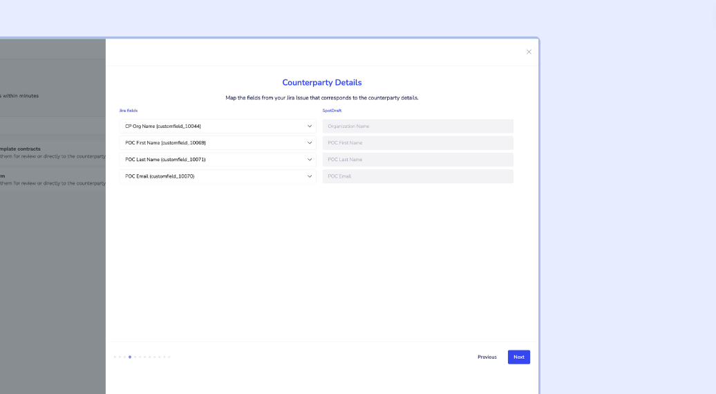 A: You will need to map Jira custom fields to corresponding fields in SpotDraft during the setup. This ensures that the right data from Jira populates the relevant sections of your SpotDraft contracts.