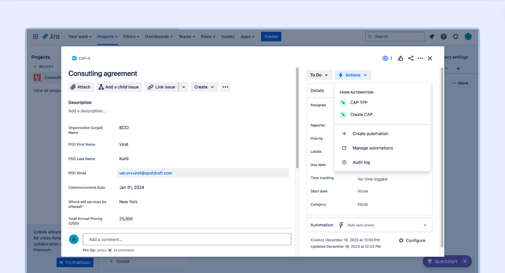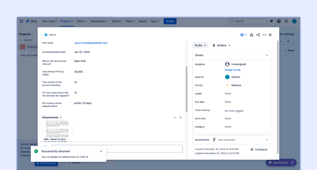 By integrating Jira with SpotDraft, you've enabled a dynamic workflow where project updates and transitions in Jira seamlessly initiate contract creation in SpotDraft. This integration not only ensures a streamlined process but also maintains accuracy and consistency, reducing manual effort and the potential for errors