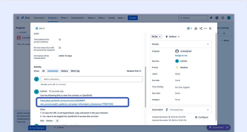 - Direct Feedback in Jira: Once your contract is drafted in SpotDraft, a link to the document is automatically posted back in your Jira issue. This keeps everything connected and easily accessible, right where you need it.