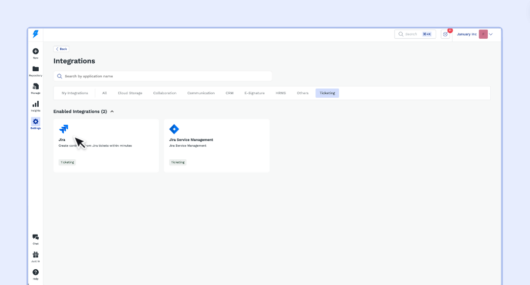 - Verify Jira Activation in SpotDraft: To ensure the Jira integration is enabled, log into your SpotDraft account and go to 'Settings' → 'Integrations' → 'Ticketing'. Check if the ‘Jira’ card is present, indicating the integration is active.