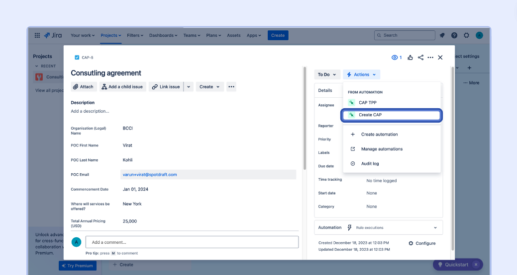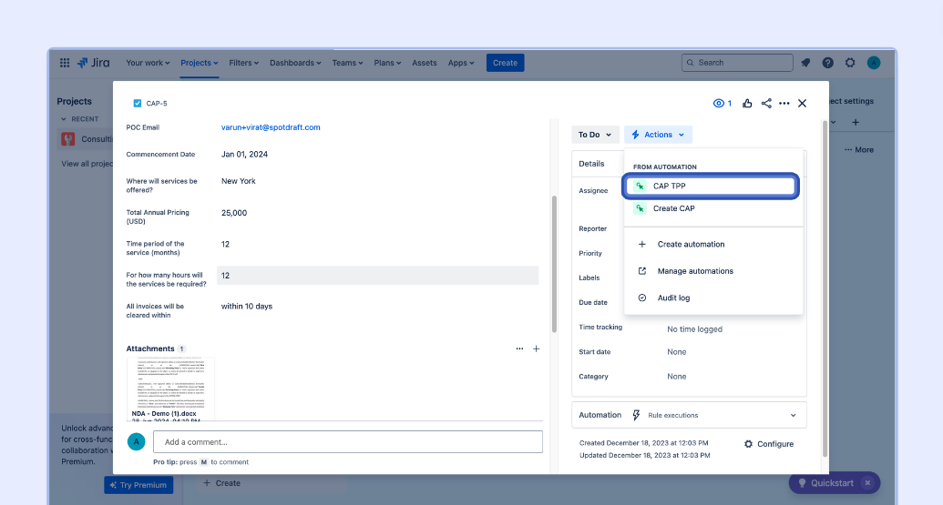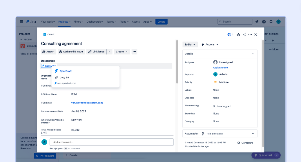 - Automated Contract Creation: Trigger the generation of contracts directly within your Jira workflow. Whether you're marking a deal as 'won' or creating a new opportunity, SpotDraft jumps into action, pulling the necessary information to start drafting the contract.