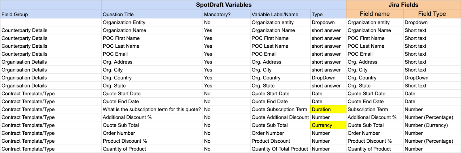 The mapping sheet will detail all of the Contract Template’s questions and have them mapped to Jira fields.