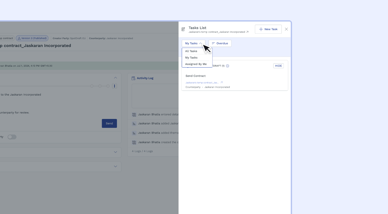 - Filter for "My Tasks": To view tasks assigned to you for that specific contract, click the "My Tasks" dropdown menu and select "My Tasks". This will display all tasks associated with that contract.