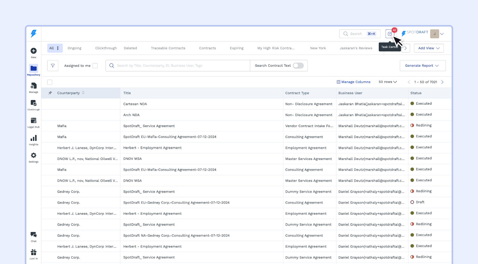 - Open the Task Center: Click the Task Center icon on the contract header