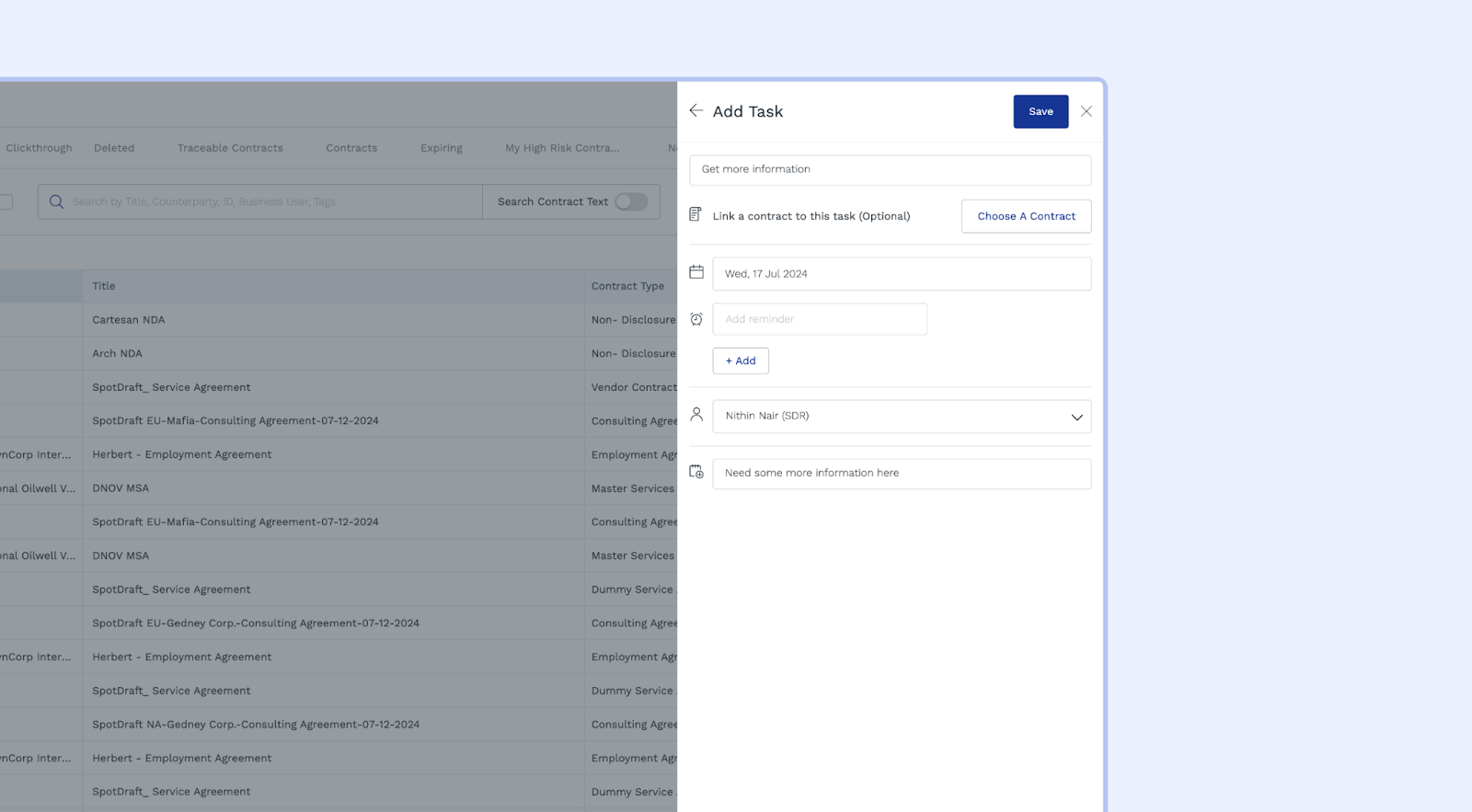 - Create Tasks: Generate tasks related to specific contracts or general contract management activities. Assign these tasks to yourself or other team members.