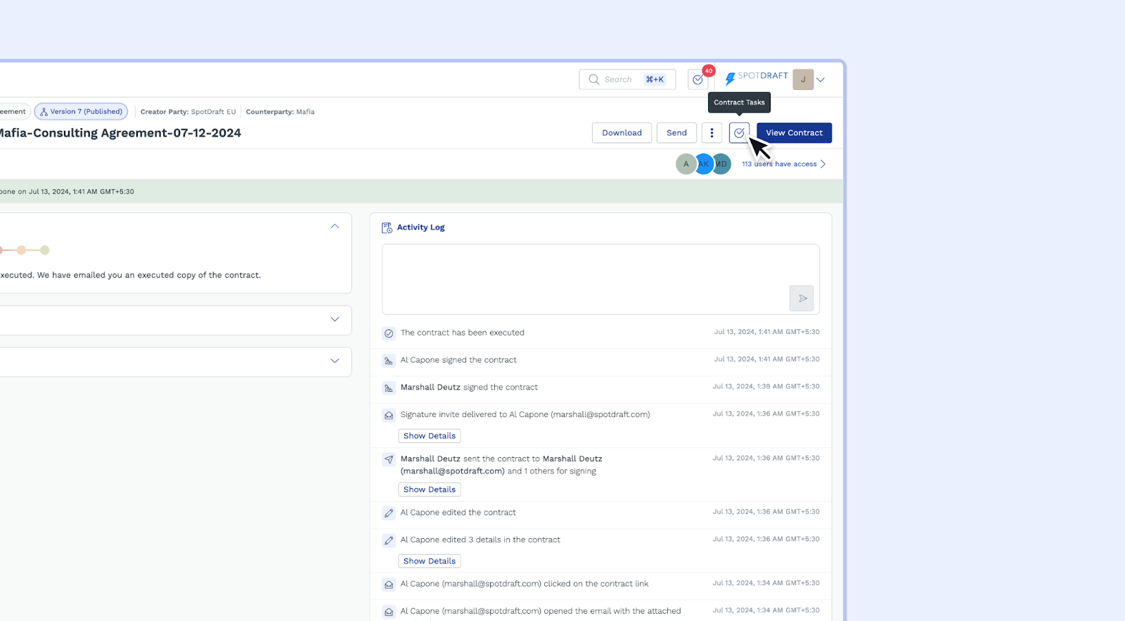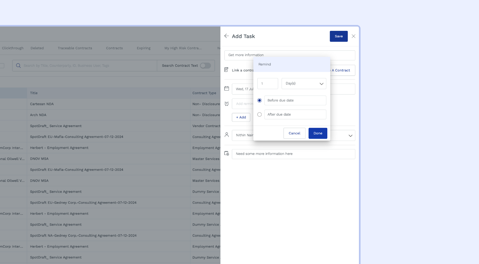Discover SpotDraft's Tasks & Reminders for efficient contract organization. Easily create, assign, track, and manage tasks.