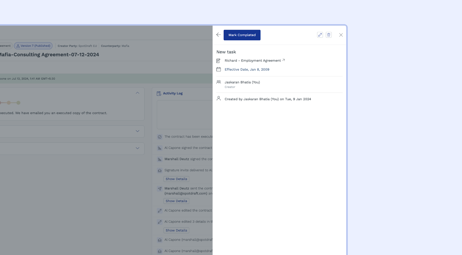 Note that only manually created tasks can be edited or deleted today. Tasks created automatically by SpotDraft based on the state of the contract cannot be modified.