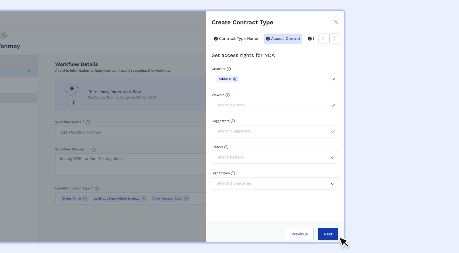 - Here, you can define roles for the new contract type, such as Creators, Viewers, Suggestors, Editors, and Signatories.