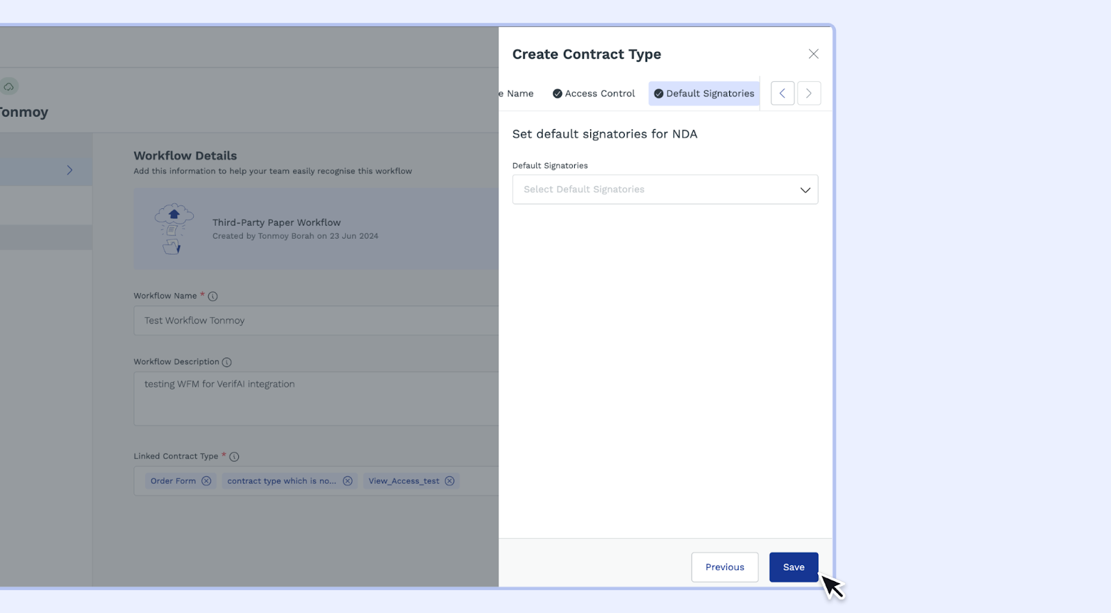 - Follow the same steps outlined in sections 4 and 5 above to set access controls and default signatories for your new contract type.