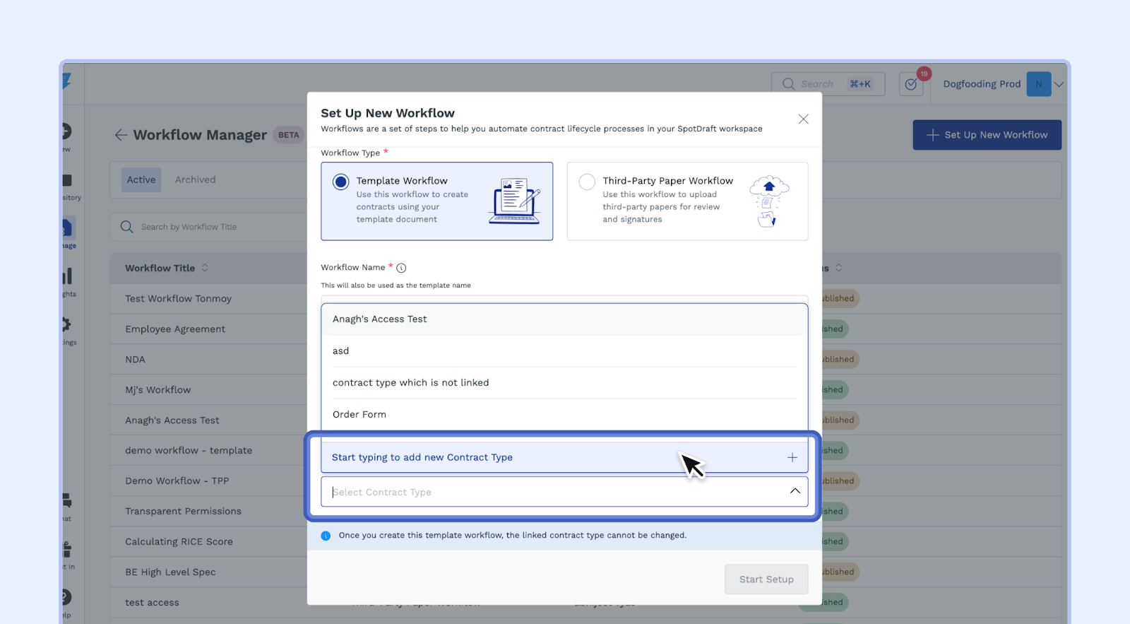 - Locked Contract Types: Once you create a template workflow, the contract type linked to that workflow is locked. You cannot change the linked contract type after the workflow is created.