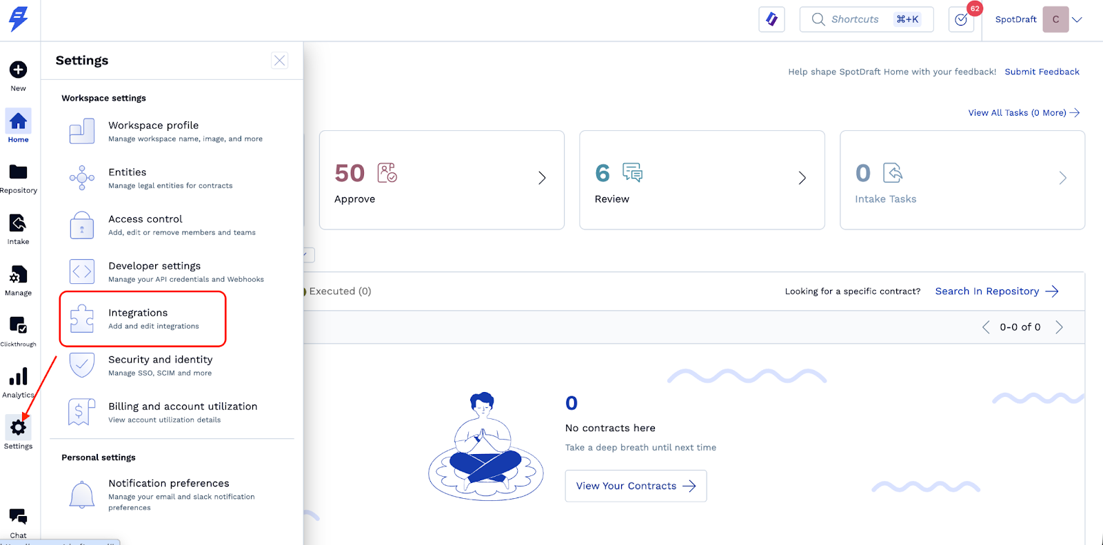 Log in to your SpotDraft workspace and navigate to ‘Settings’ → ‘Integrations’.