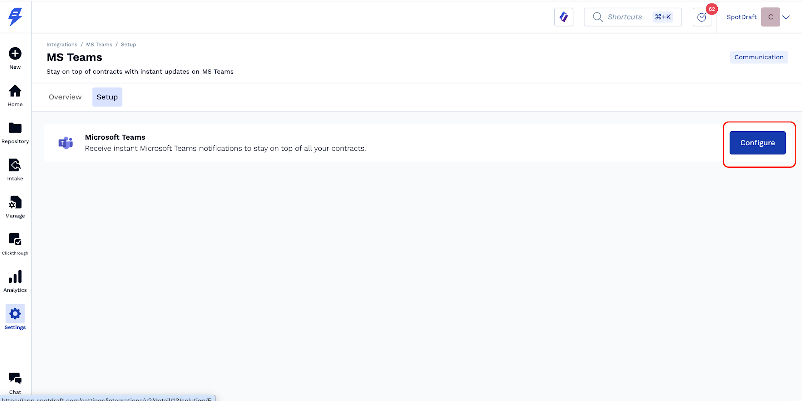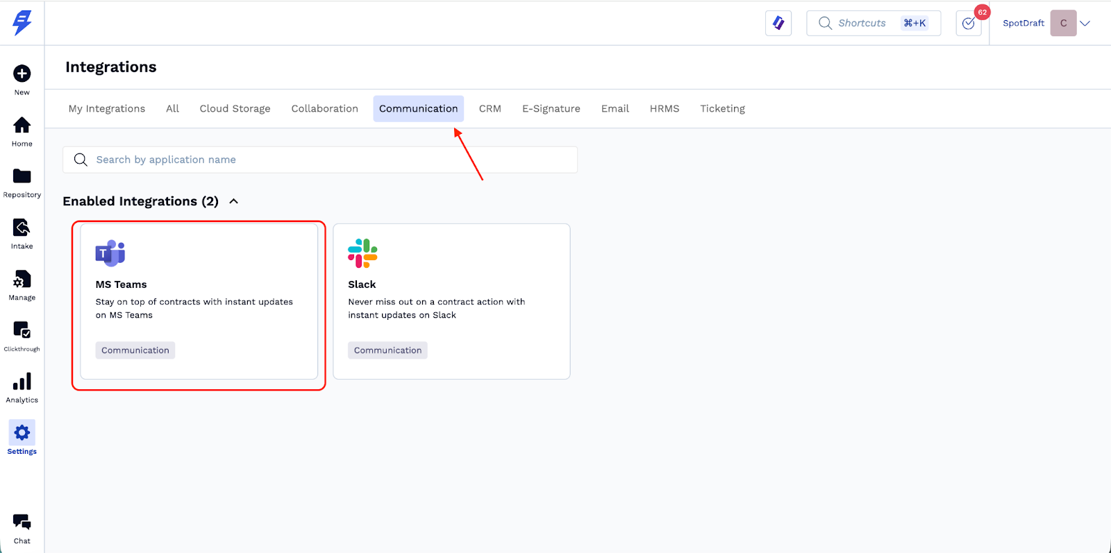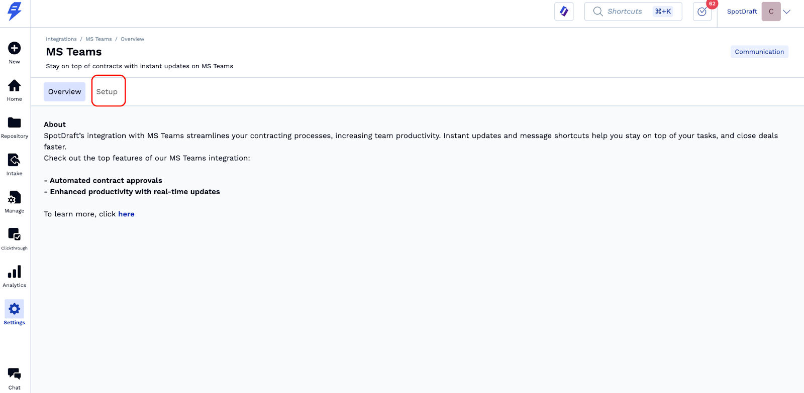 Ensure the "Microsoft Teams" integration is enabled in your SpotDraft workspace.