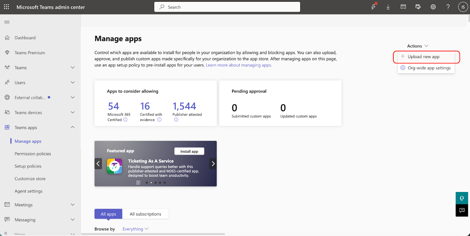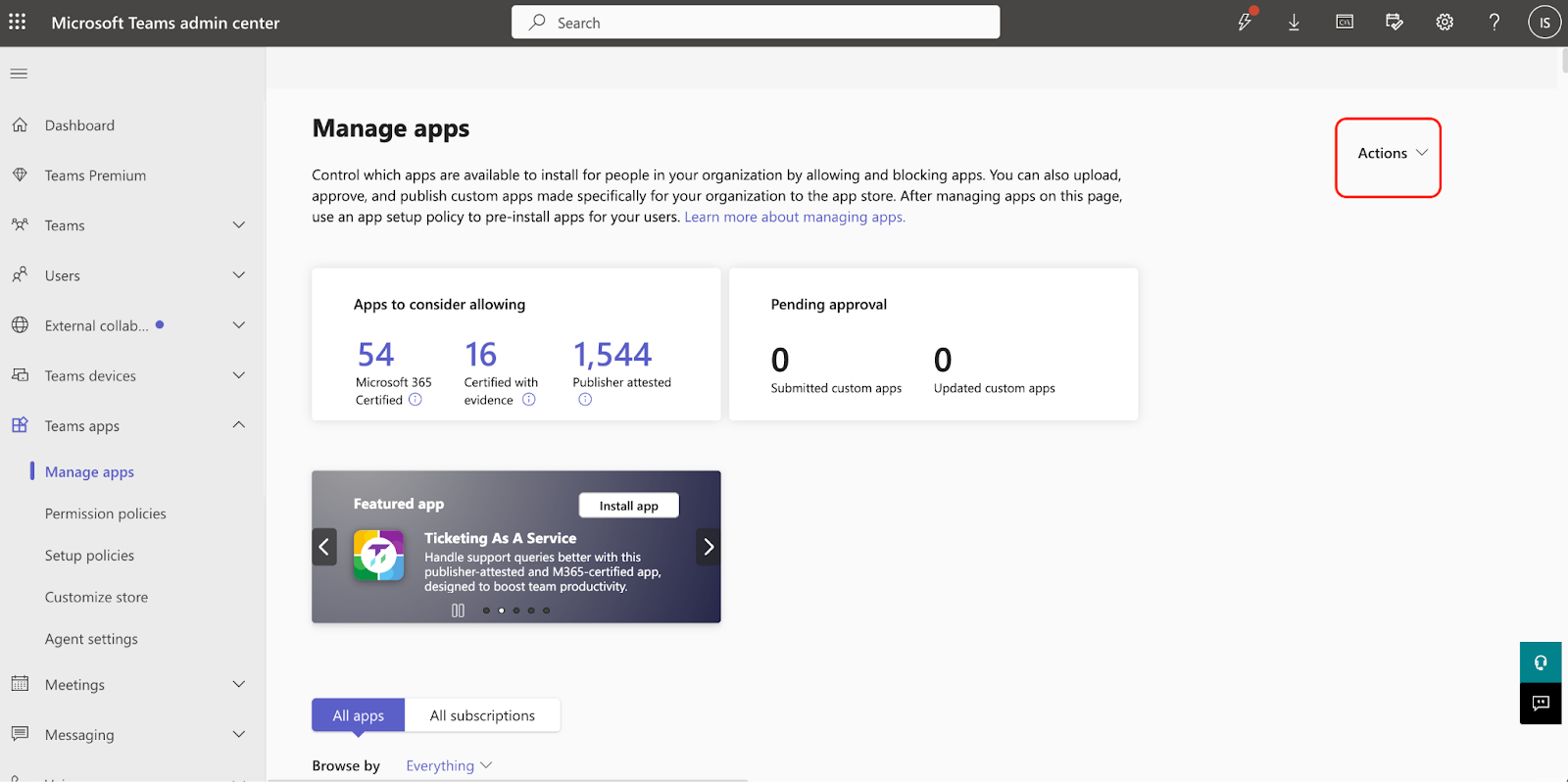 On the Microsoft Teams Admin Center, click on Actions to add a new app.