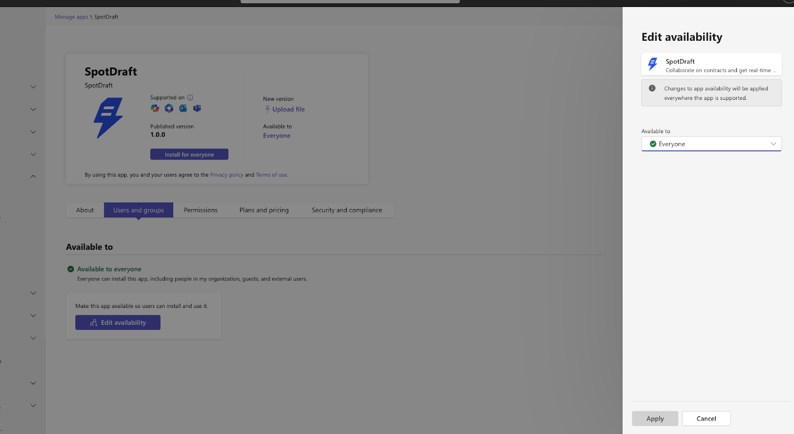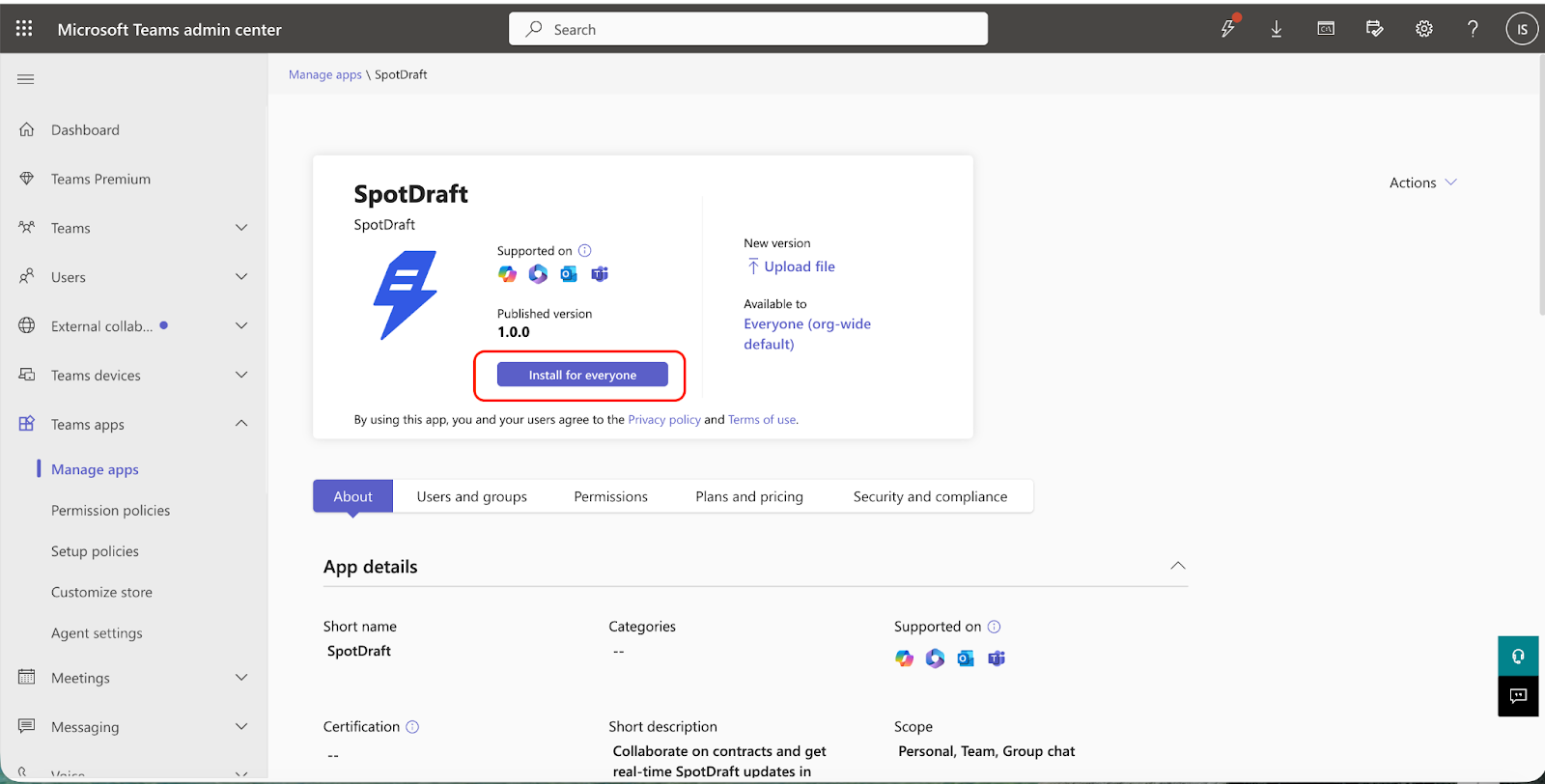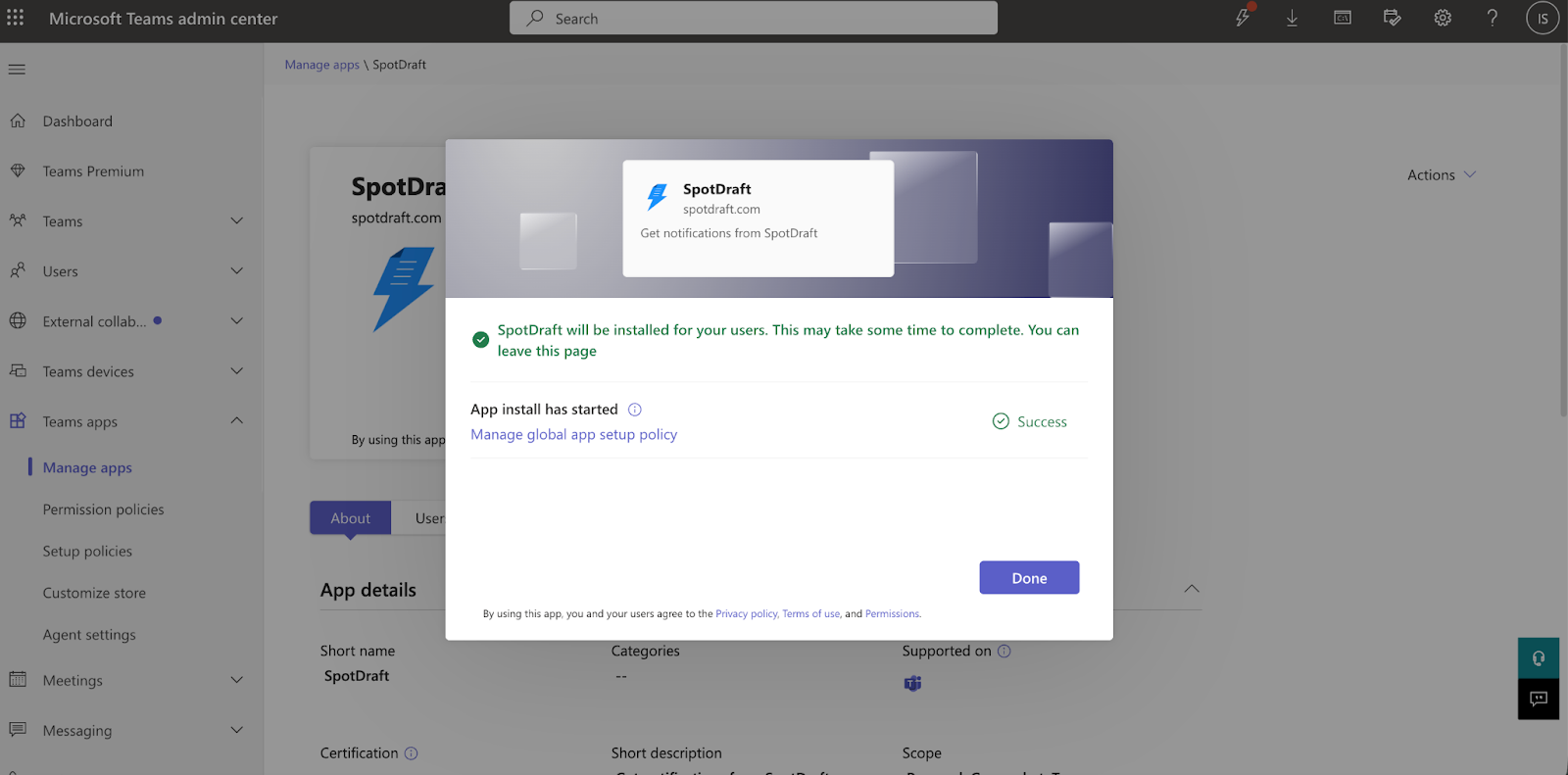Microsoft Teams Admin Approval (If Required). If your organization's policy requires admin approval for new apps, ensure that the SpotDraft Teams integration is pre-approved to avoid delays.