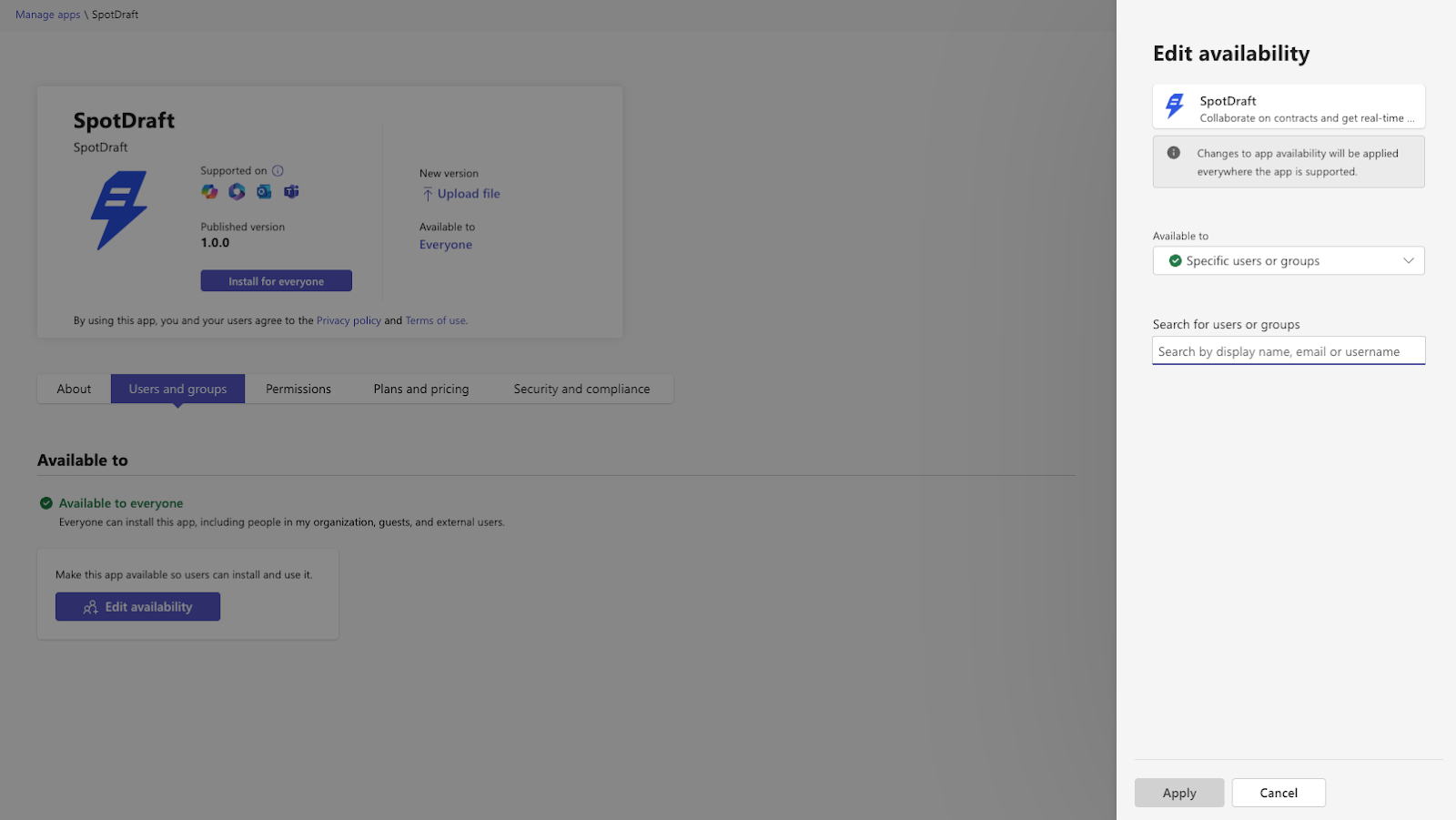 Or to restrict access to only certain users/ teams, change the availability to Specific users or groups